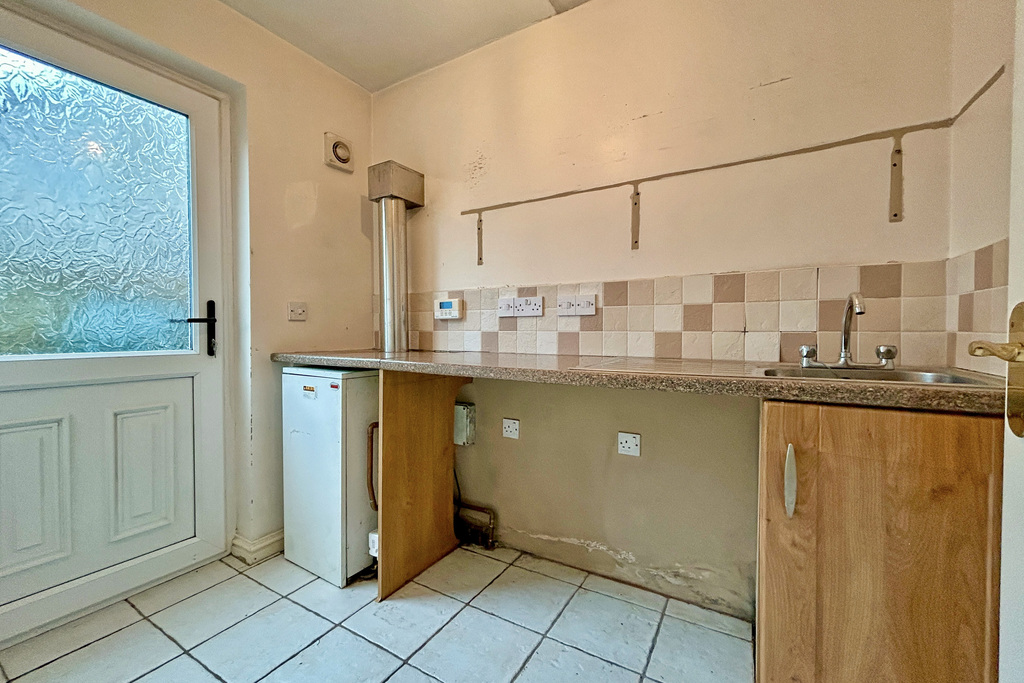 Fitted unit; laminate work surfaces; stainless steel sink & drainer; spaces for under counter appliances; oil boiler; tiled floor; part tiled walls; door to the rear.