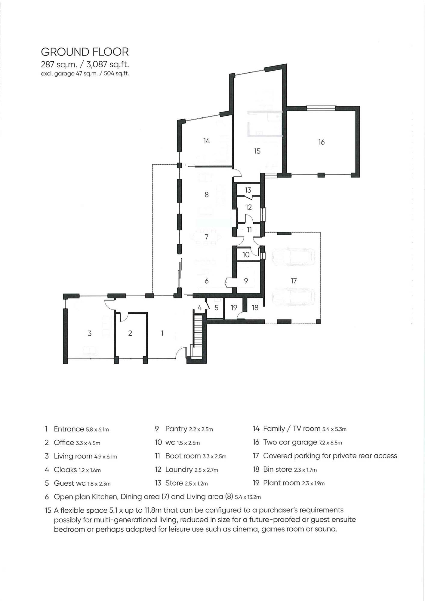 The stunning and contemporary design concept centres round a very large family living space with dining and kitchen area, and all the associated pantry and laundry room facilities one might expect. Private access through a boot room will be from a covered two vehicle carport in a courtyard area where there is also a two-car garage. There are three further reception areas, five bedrooms, a home office and a gym. A feature of the initial design is the statement principal bedroom suite. It is a large space that includes dual dressing areas and ensuite facilities with a bath and separate WC.