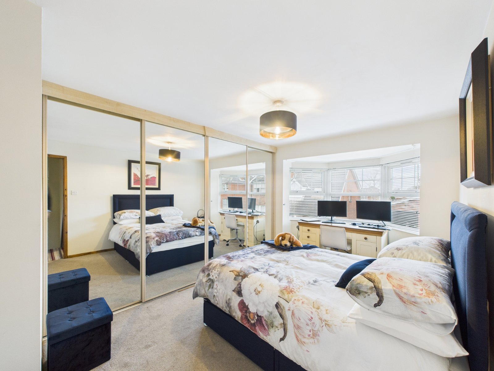 Into bay. Built in wardrobes with mirrored sliding doors.