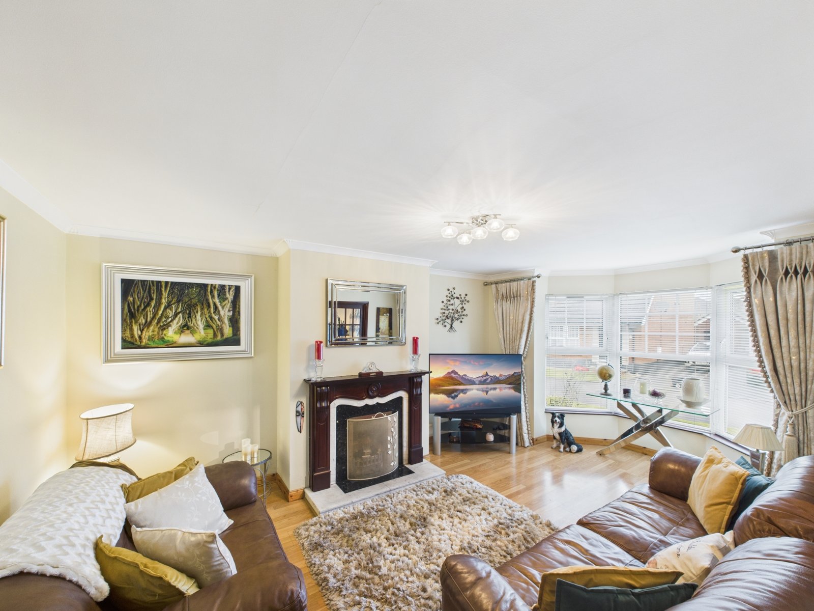 Wood laminate floor, fireplace with marble surround and open fire, French double doors to: