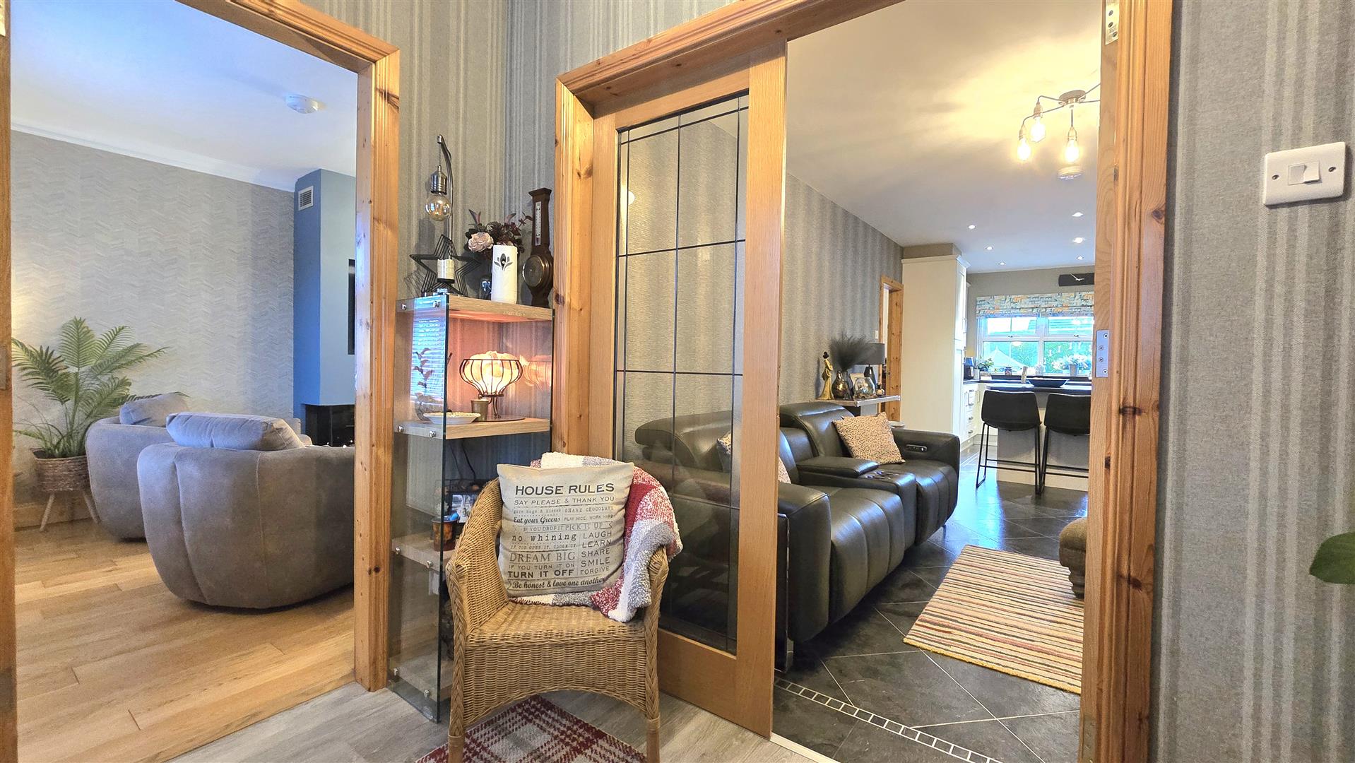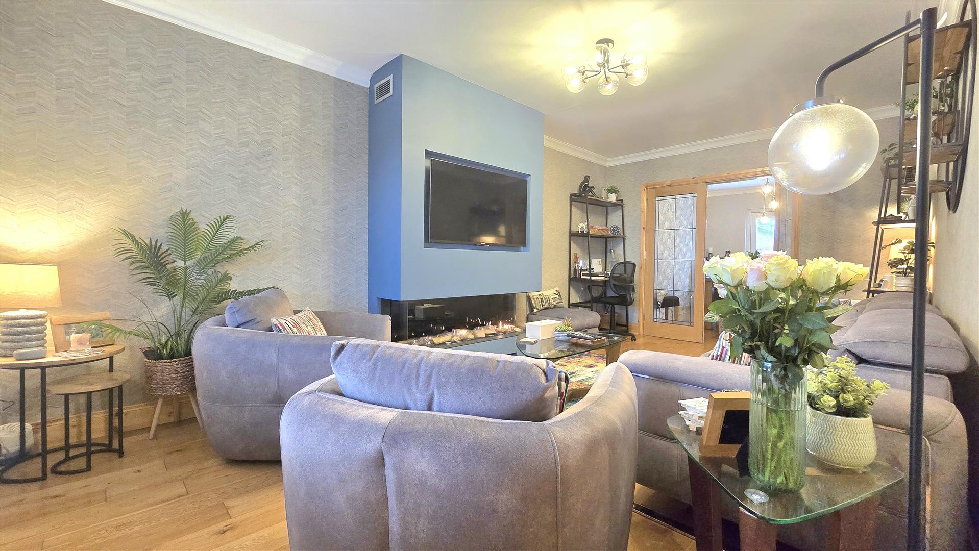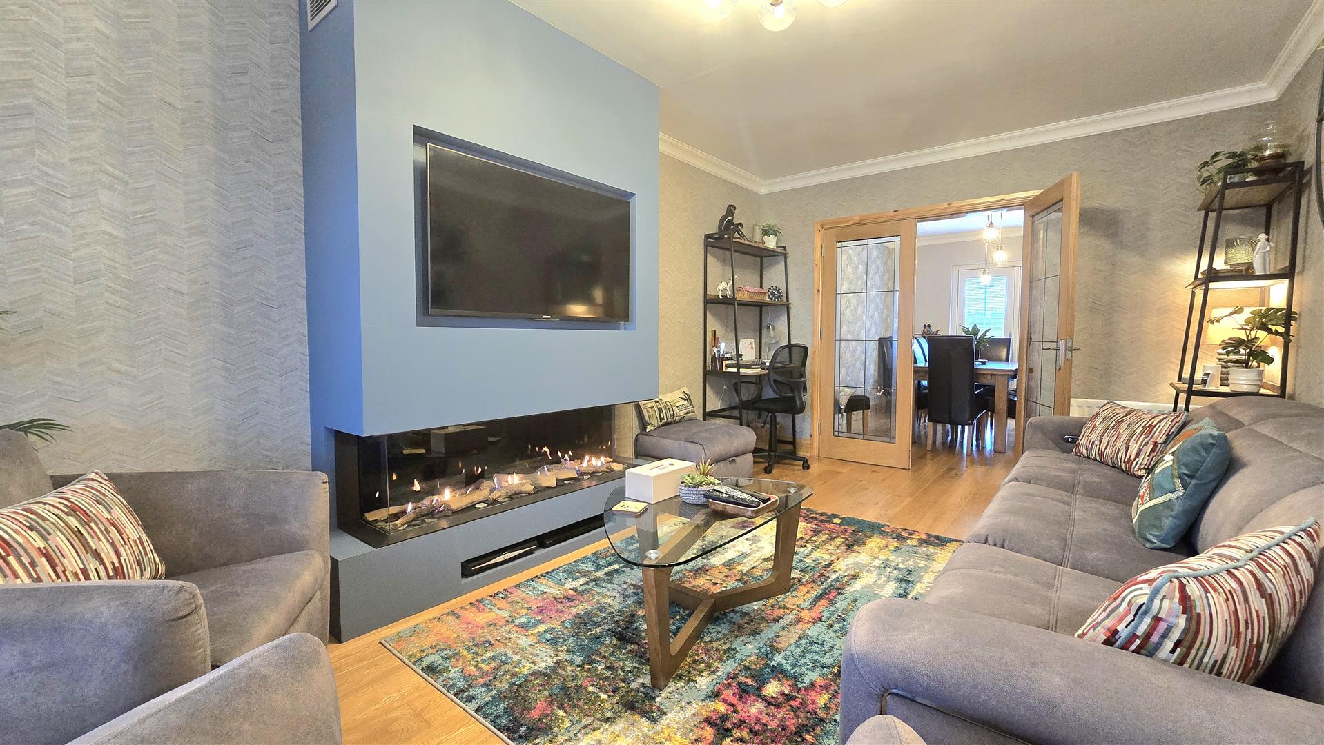 The principle feature of this room is the stunning three sided frameless glass gas fire inset into the chimney breast. Solid Oak flooring, ceiling coving. French doors opening into the Dining Room.
