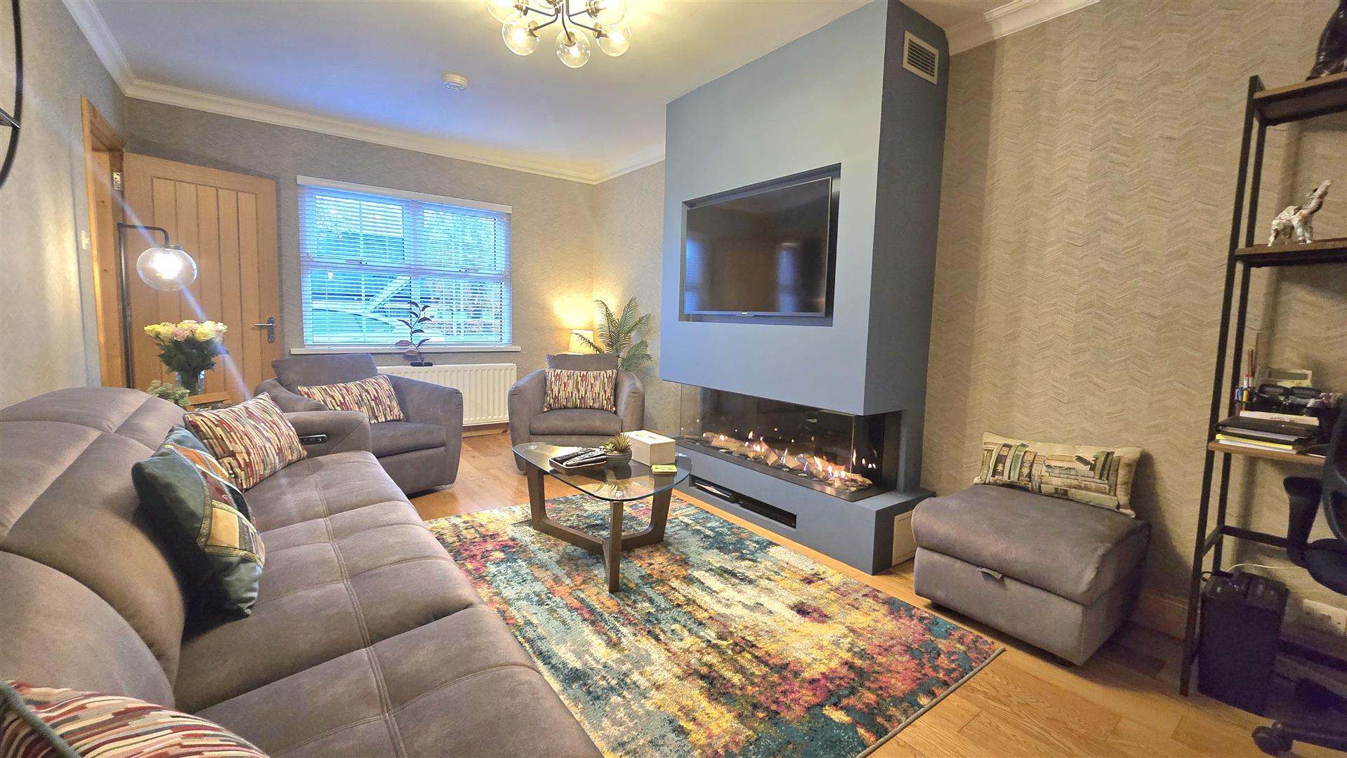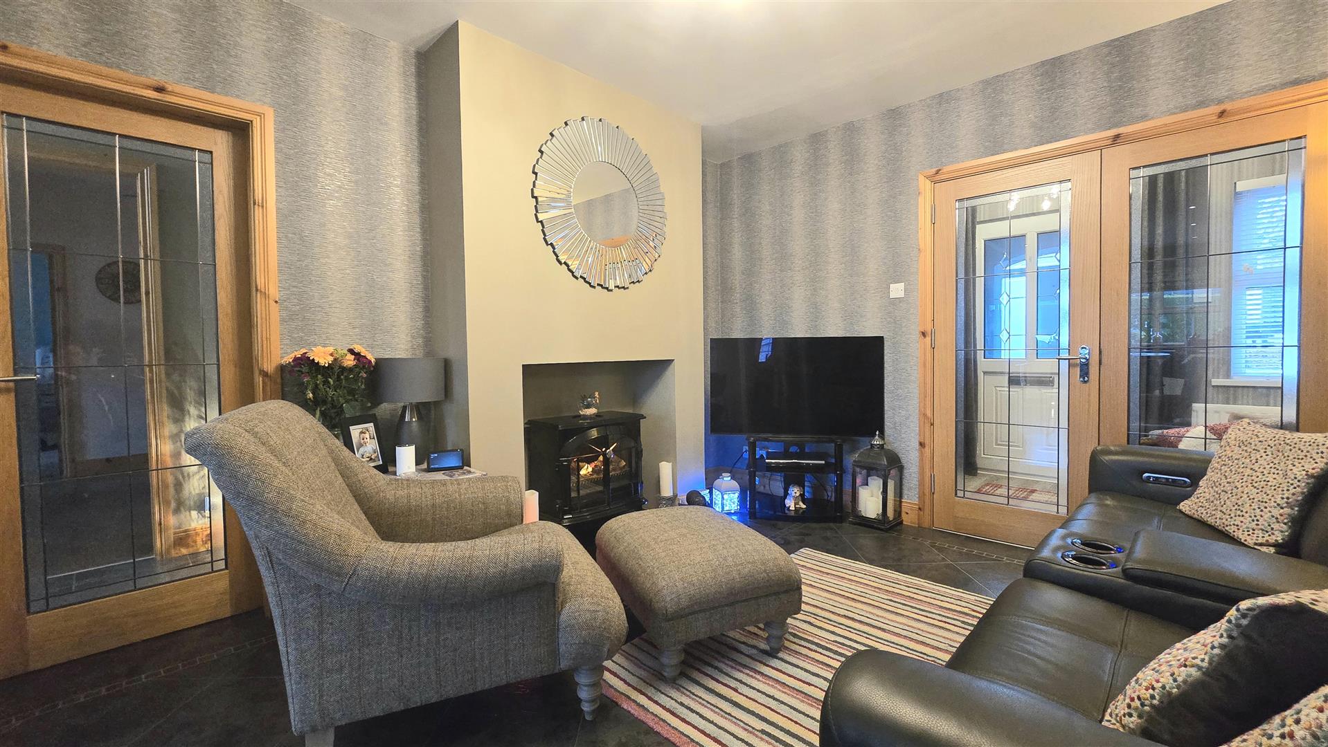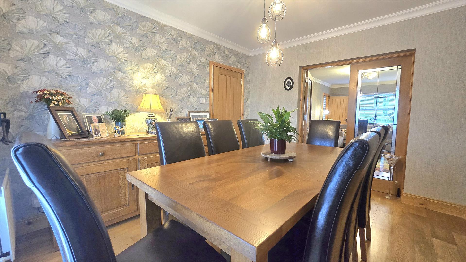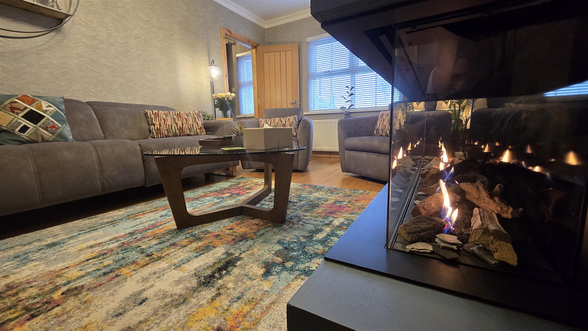 The principle feature of this room is the stunning three sided frameless glass gas fire inset into the chimney breast. Solid Oak flooring, ceiling coving. French doors opening into the Dining Room.