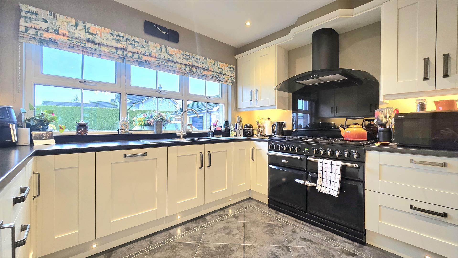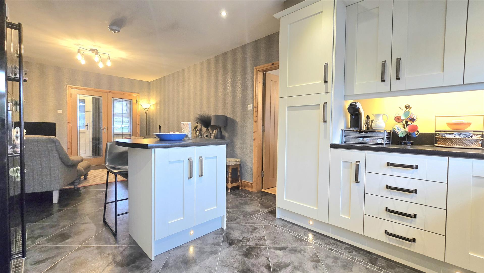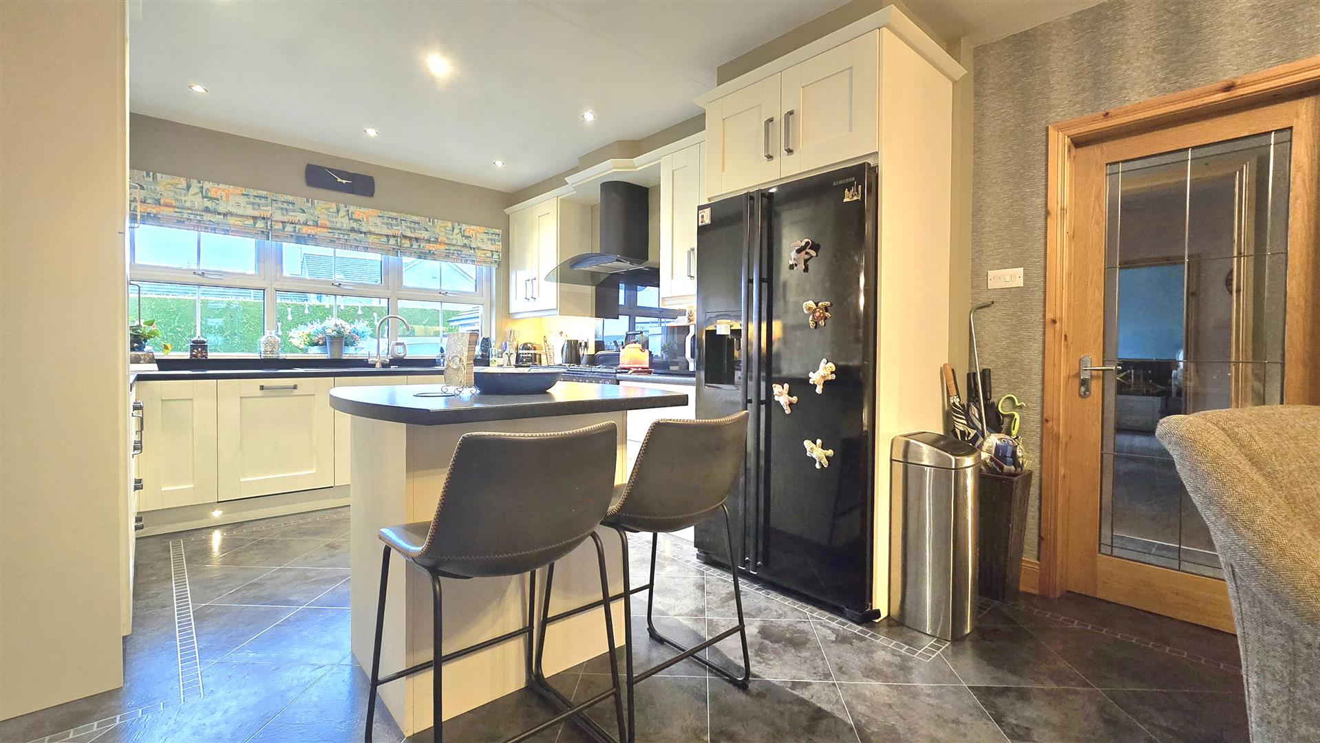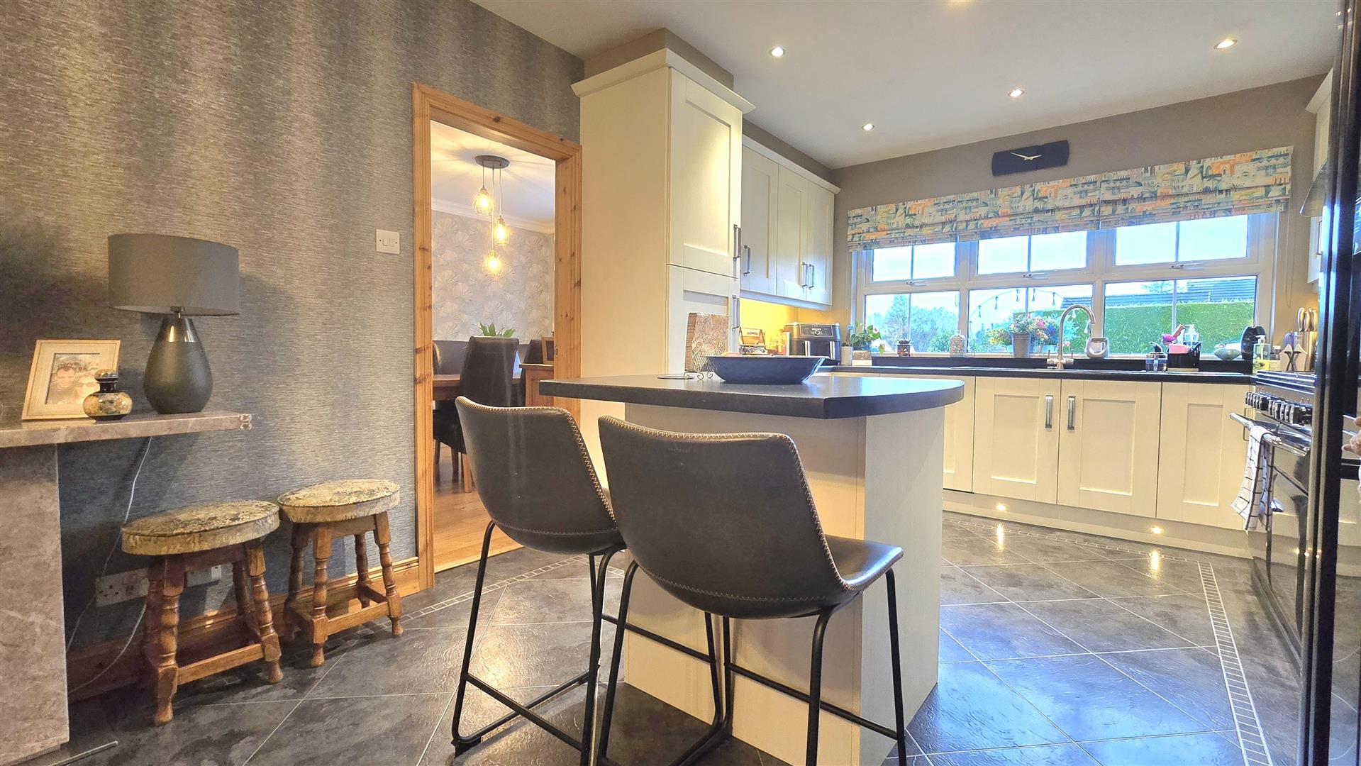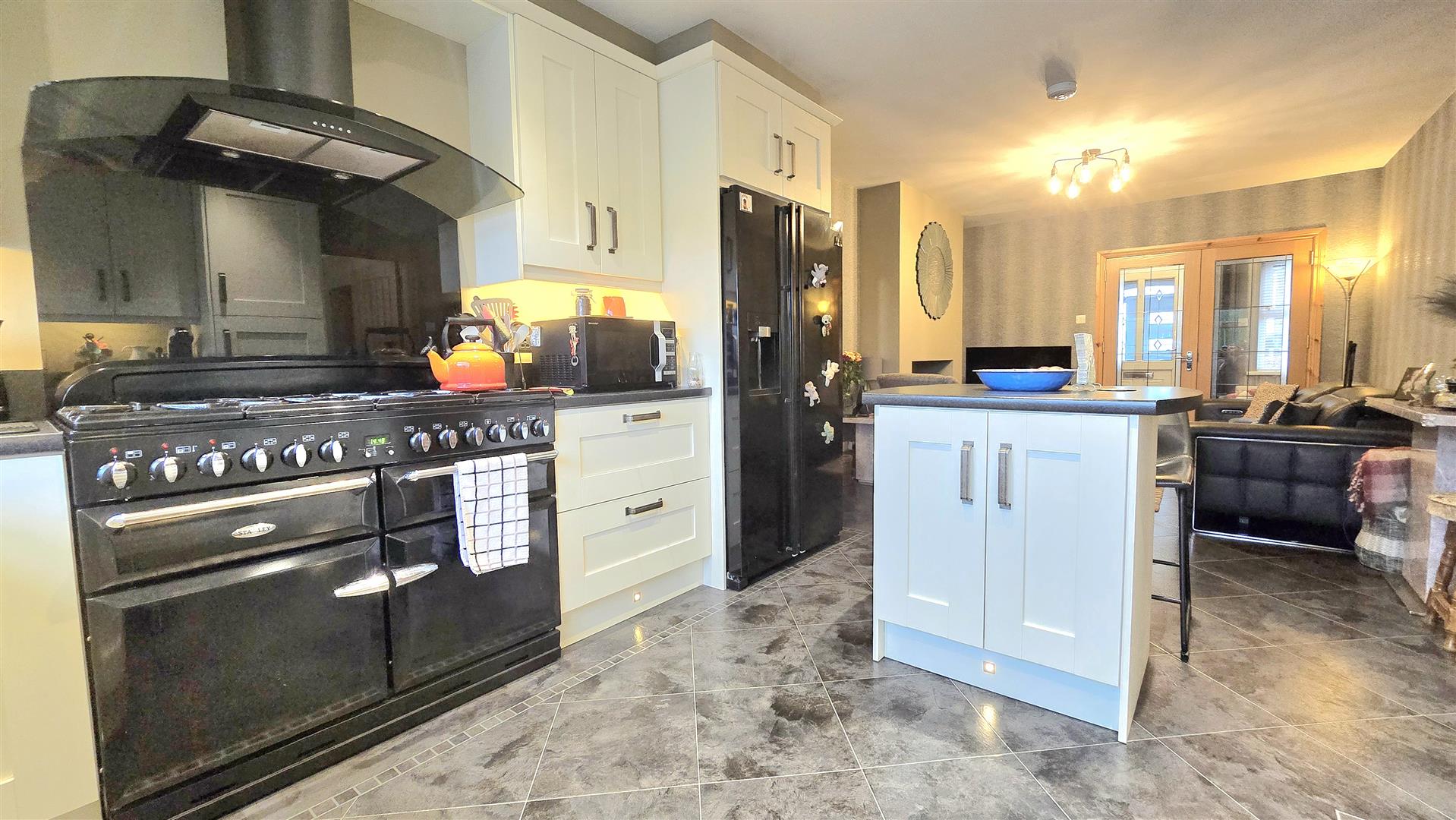 Fitted with a range of contemporary shaker style eye and low level units. Laminate work surfaces with matching upstands. Stanley range cooker with a six ring gas hob and twin electric ovens. Space for American Fridge/ Freezer. Integrated Dishwasher. Matching centre island with breakfast bar and low level storage. Set in an open plan with a Living Area, space for electric stove on a polished granite hearth. Karndean Laminate flooring.