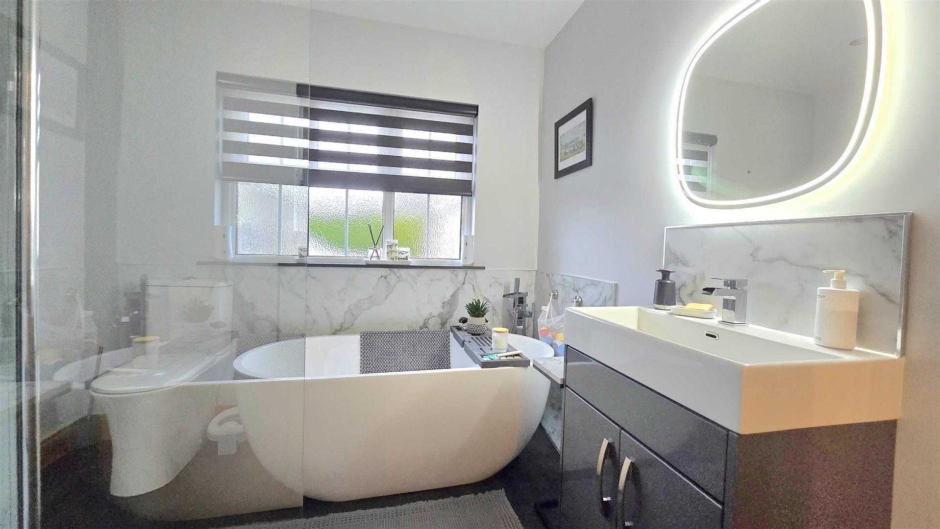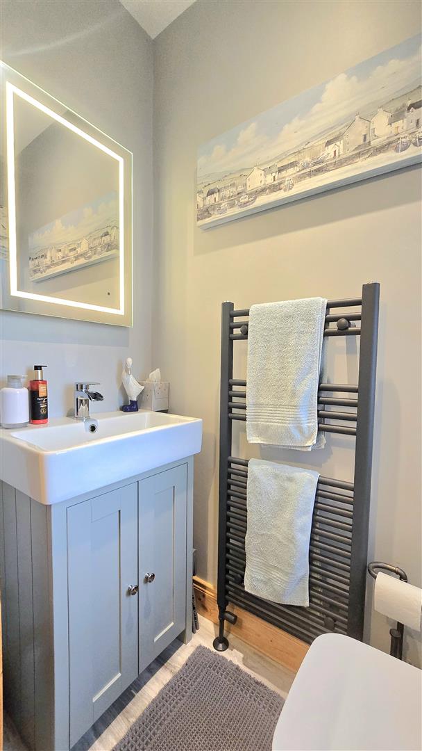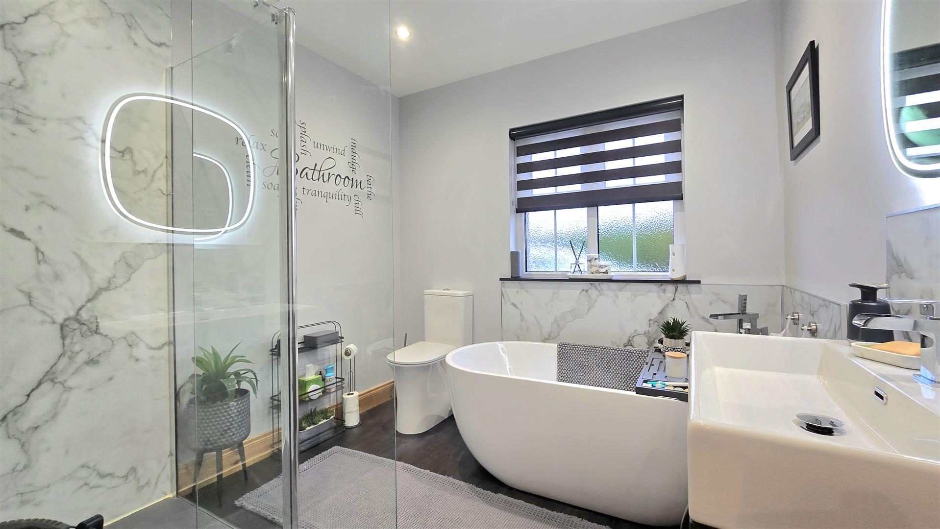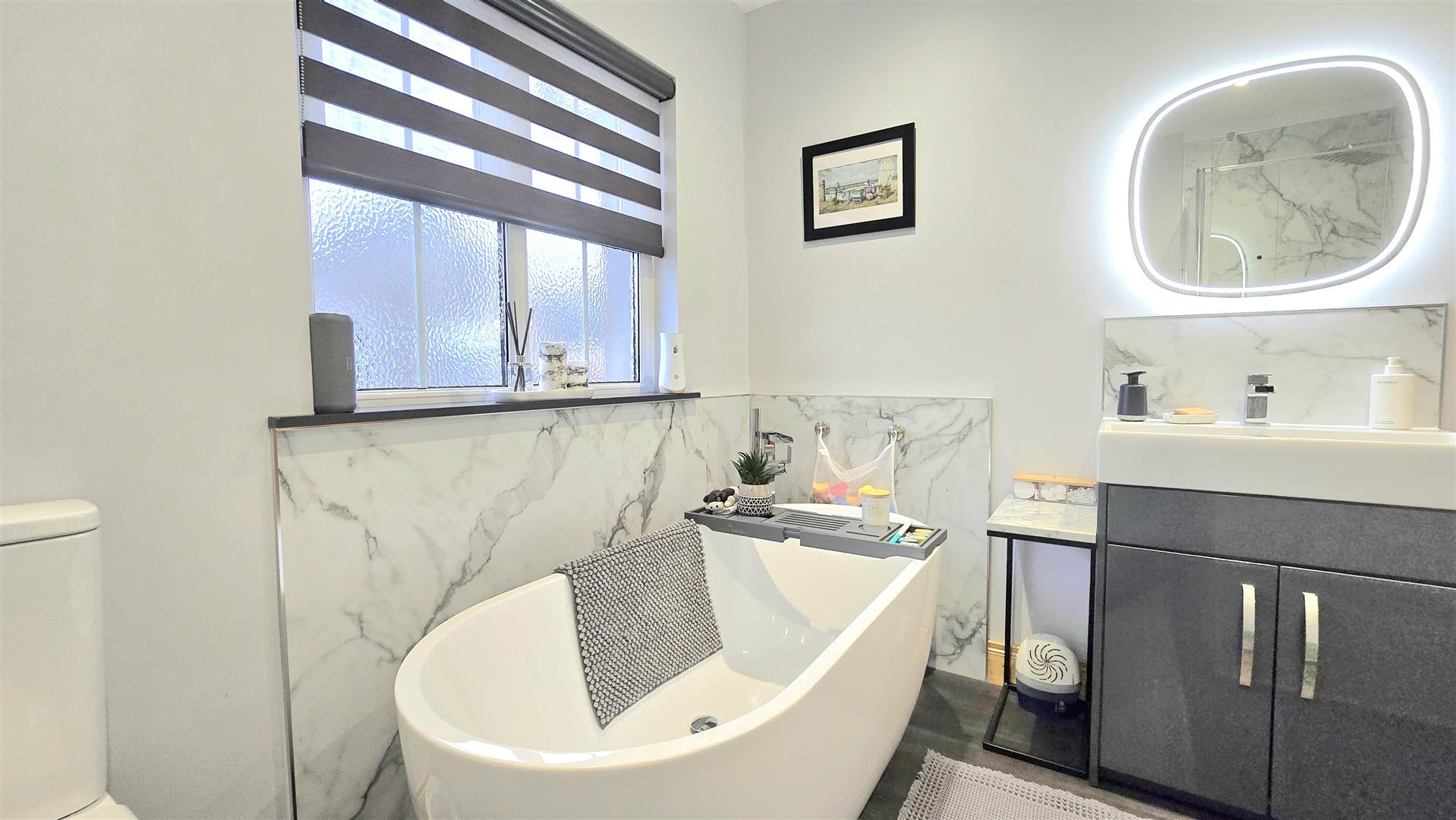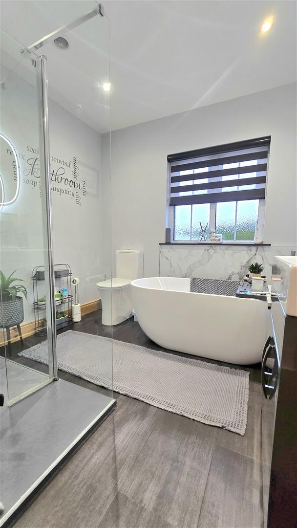 Fitted with a contemporary suite, including a freestanding bath, large shower cubicle, LFWC and wash hand basin with vanity unit beneath and LED lit mirror over. Marble effect splashback areas and tile effect laminate flooring. Recessed ceiling lighting. Built in wardrobe.