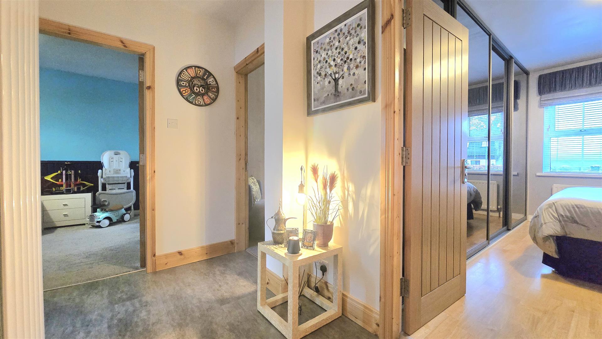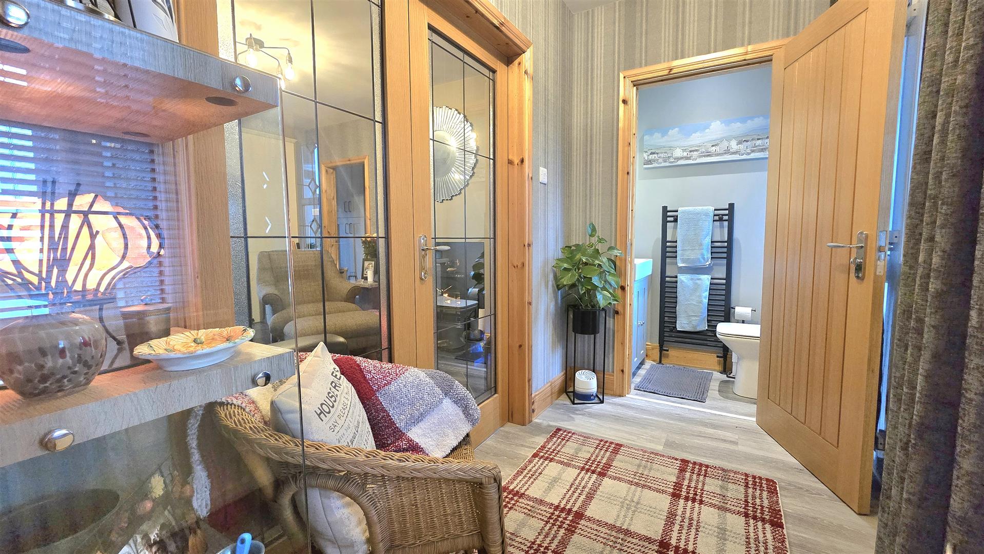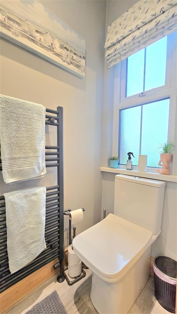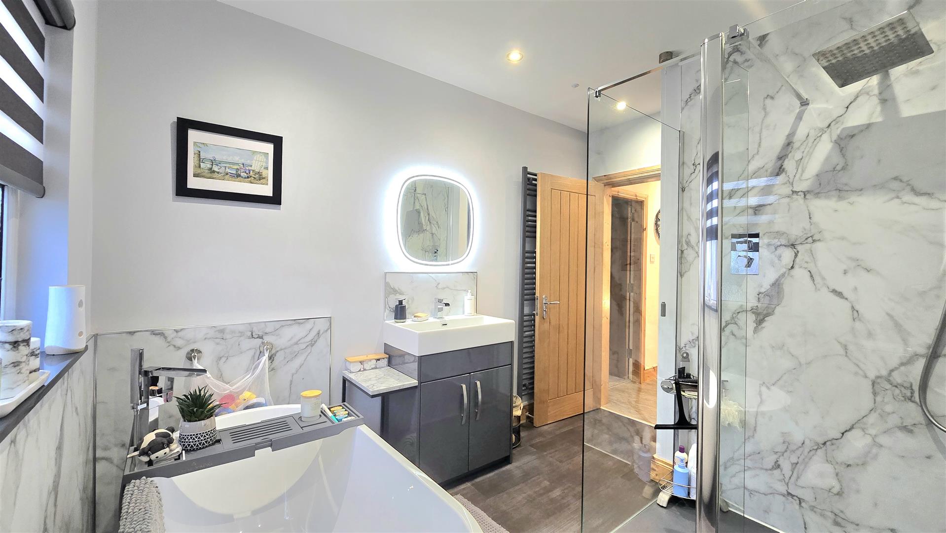 Fitted with a contemporary suite, including a freestanding bath, large shower cubicle, LFWC and wash hand basin with vanity unit beneath and LED lit mirror over. Marble effect splashback areas and tile effect laminate flooring. Recessed ceiling lighting. Built in wardrobe.
