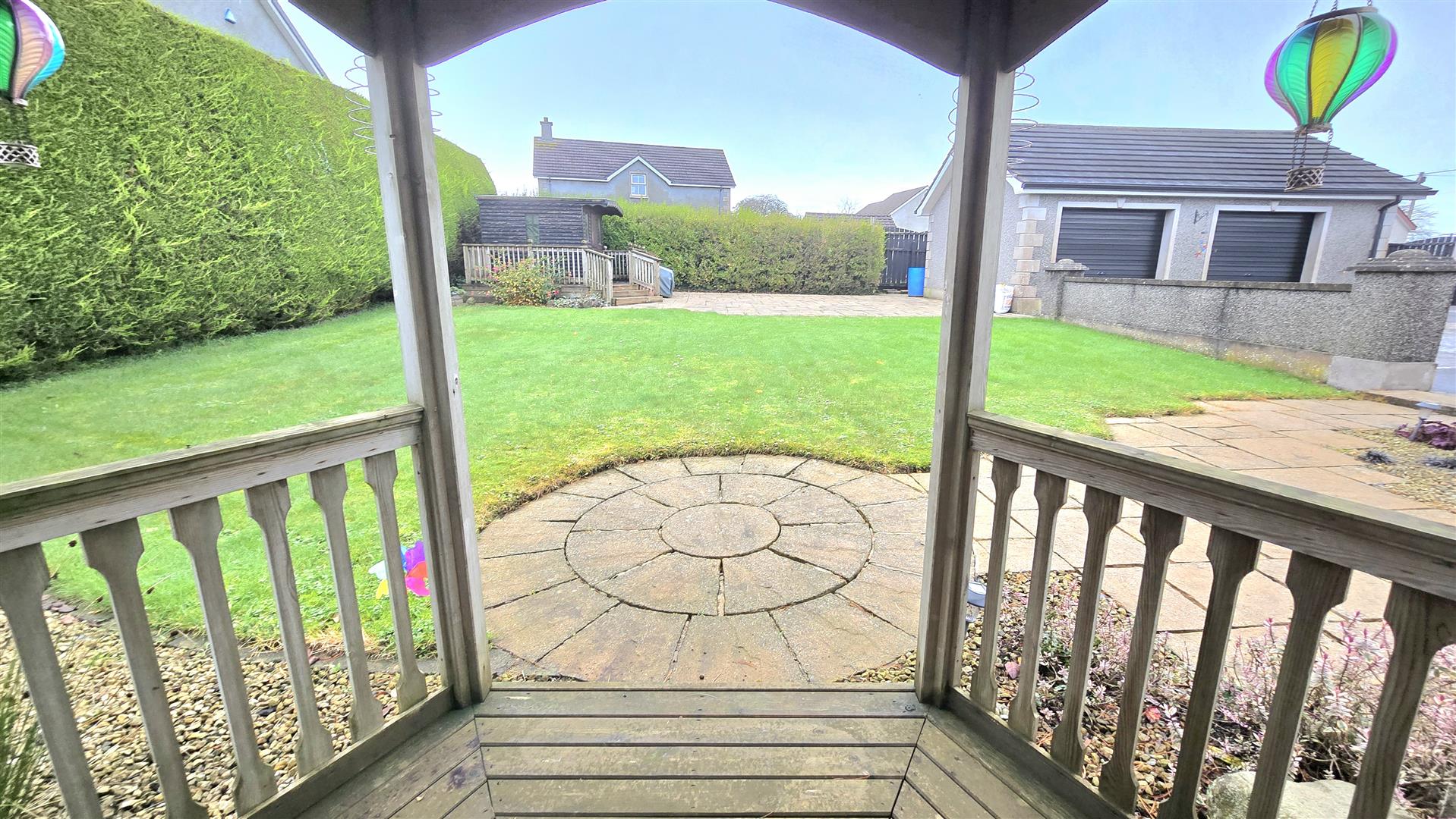 Set on a site of approximately one third of an acre, the property has ample outside space. The front garden is laid in lawn with a gravel driveway extending to the side, leading to a large back yard. The back garden is laid in lawn, screened by mature hedging, with a summerhouse and patio areas.