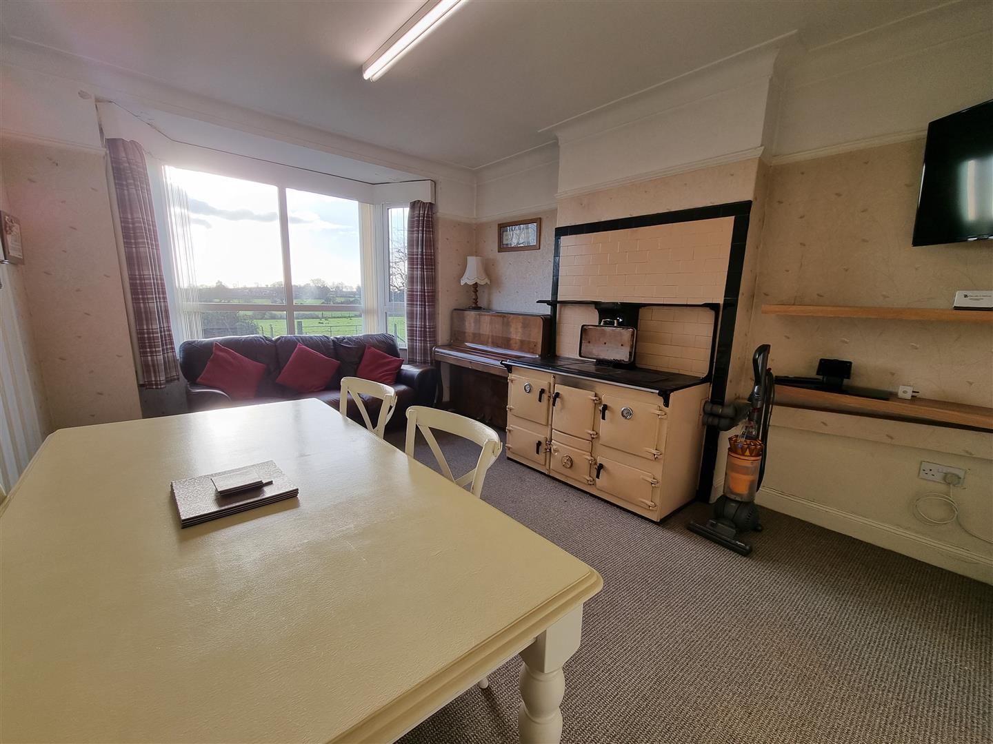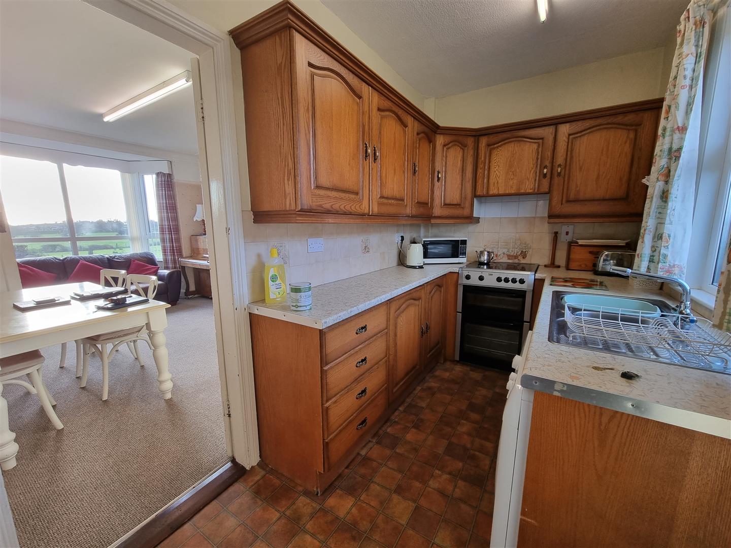 Fitted with a range of Oak eye and low level units, laminate work surfaces with tiled splash back areas over. Cooker with integrated extractor fan over. Washing machine.