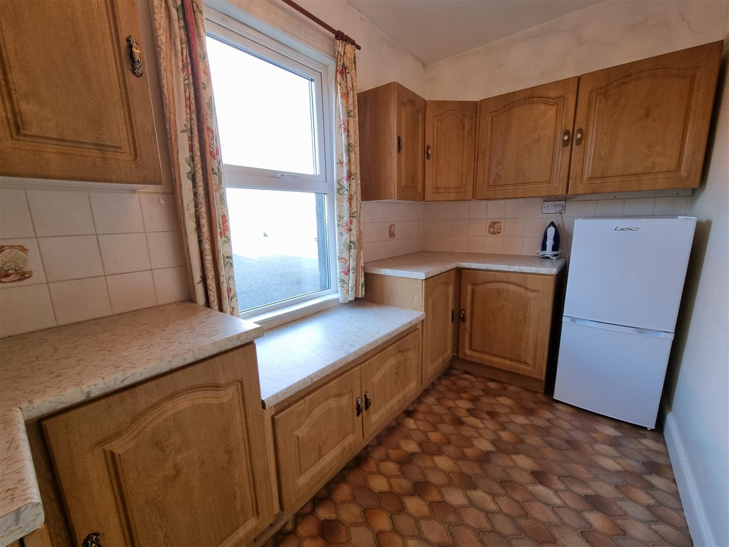 Fitted with a range fo eye an d low level units. Laminate worksurfaces with tiled splash back areas over. Fridge/freezer
