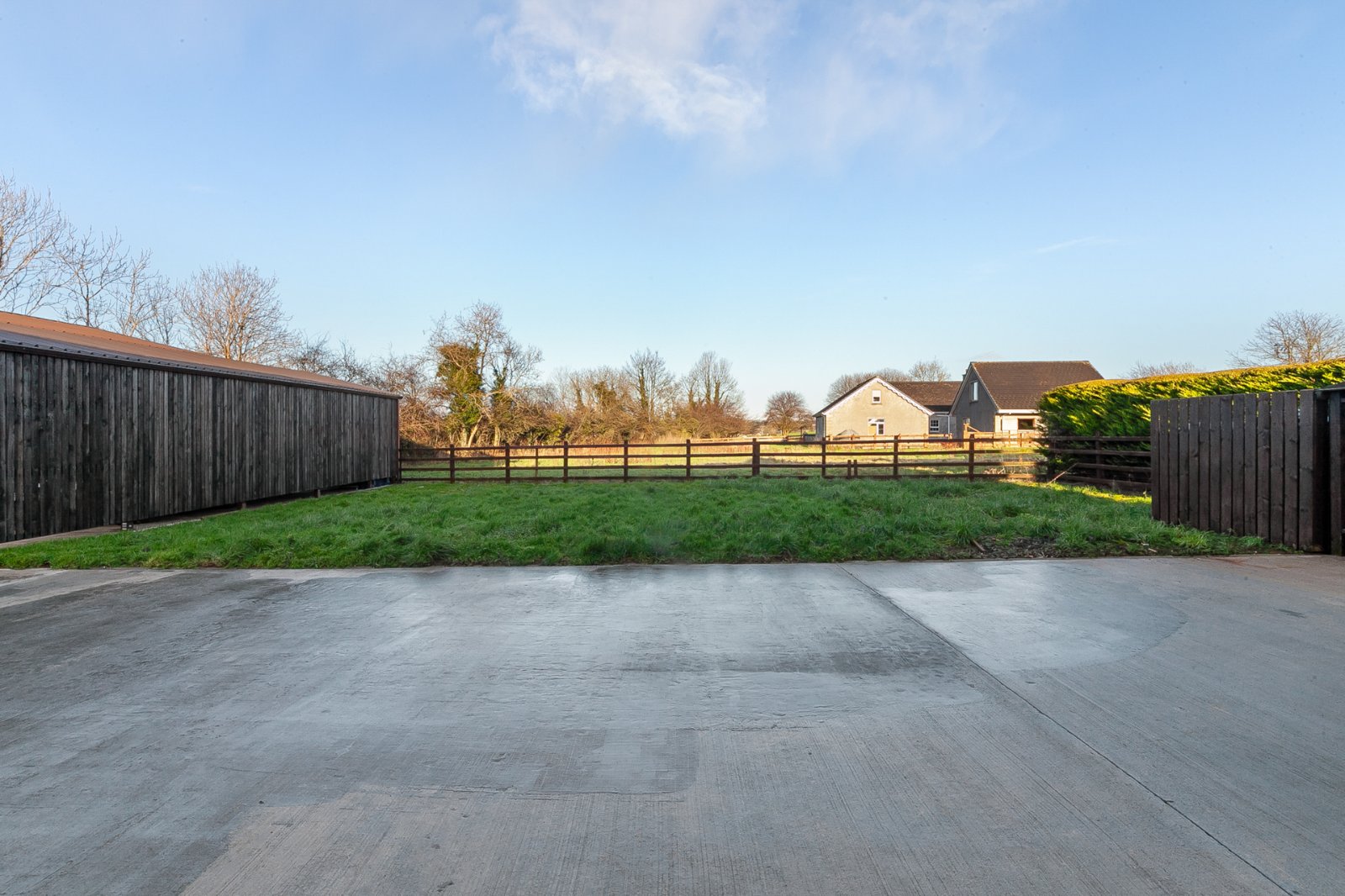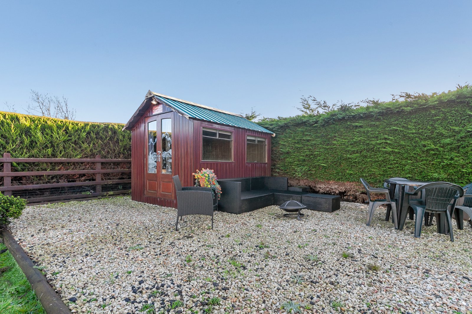 Tarmac driveway leading to excellent parking and turning areas with additional hardstanding to the rear. Generous, level, front, side and rear gardens in lawns. Large agricultural shed ideal for a multitude of uses and adjoining car port.