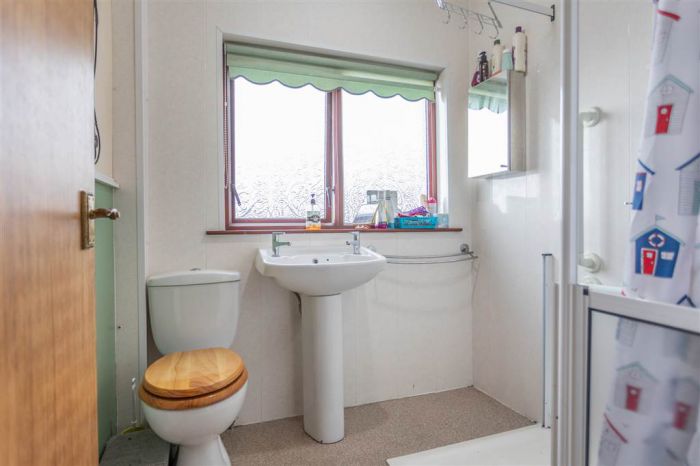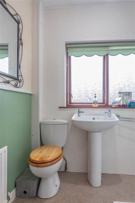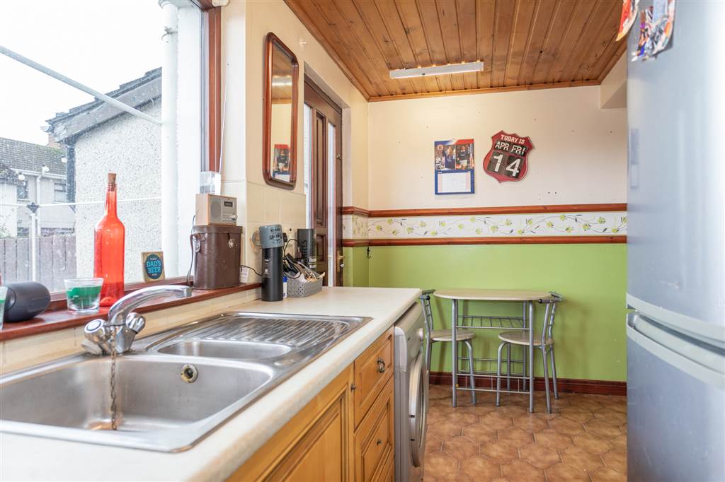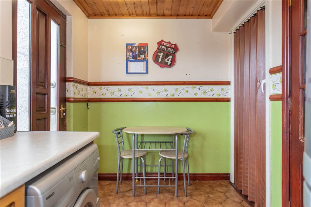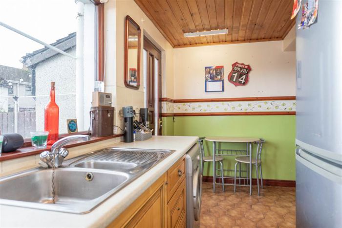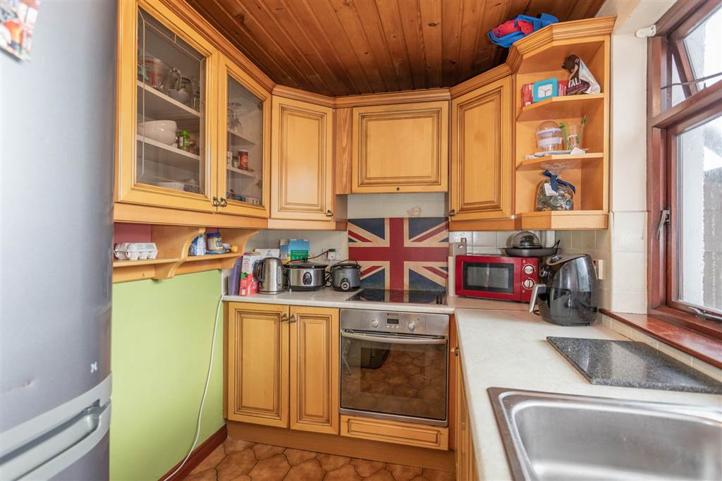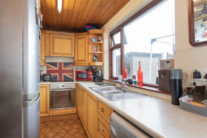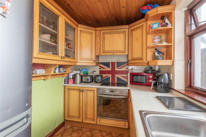 With a range of eye and low-level fitted units, 1 1/4 bowl stainless-steel sink unit and drainer with stainless-steel mixer tap. Integrated four ring electric hob and oven with stainless-steel extractor fan over. Plumbed for washing machine. Space for fridge-freezer. Saucepan drawers. Cutlery drawer. Glazed display units. Splash back tiling. Tiled flooring. Hardwood door to rear.