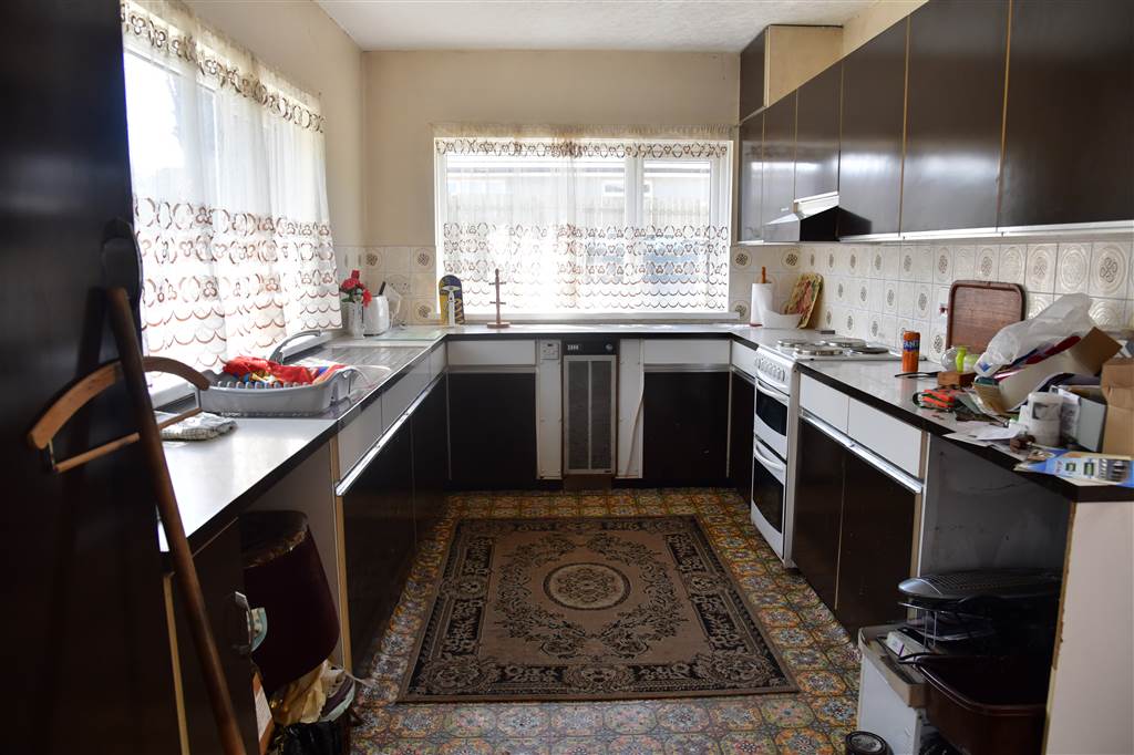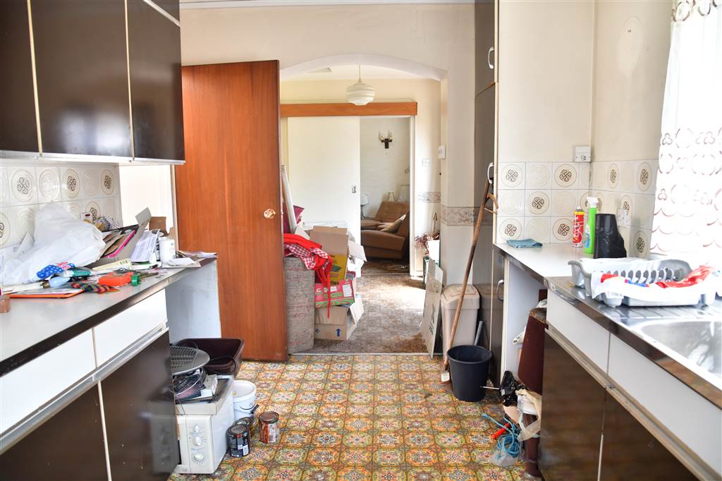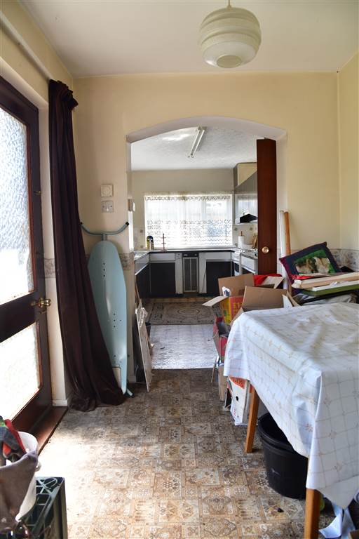 With a range of eye and low-level fitted units, stainless-steel sink unit and drainer with stainless-steel mixer tap. Space for four ring electric hob and oven with extractor fan over. Cutlery drawers. Larder cupboard.