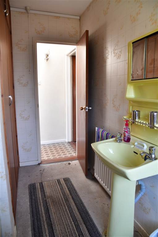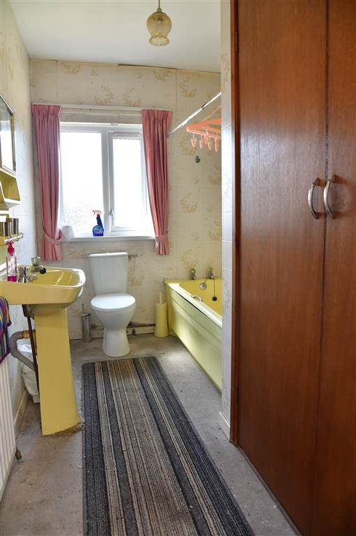 3-piece suite comprising LFWC, WHB and panelled bath. Hot-press with shelved storage.