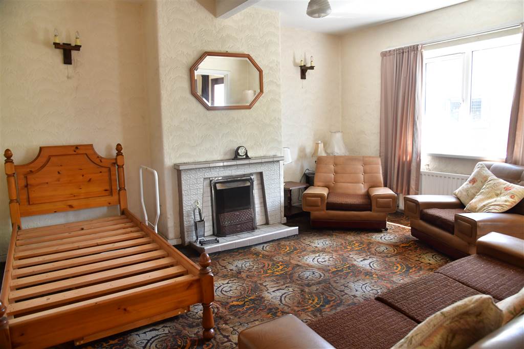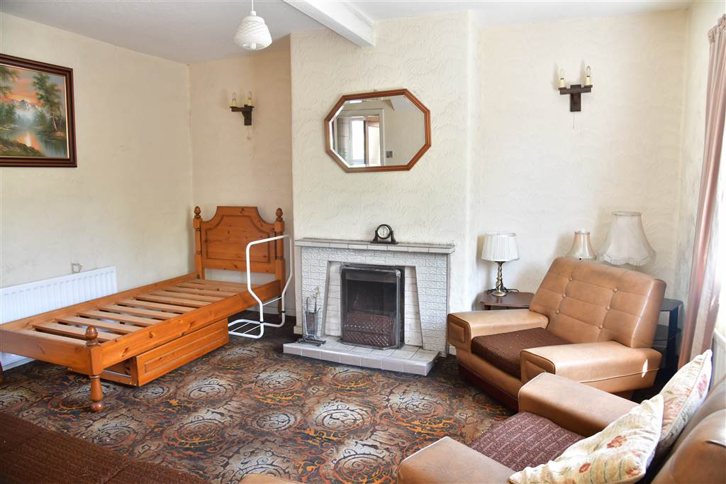 With fireplace to tiled hearth, surround and mantle. Wall lights. Sliding door to rear hallway.