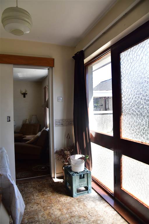 With hardwood glazed door with glazed side panes. Archway to kitchen.