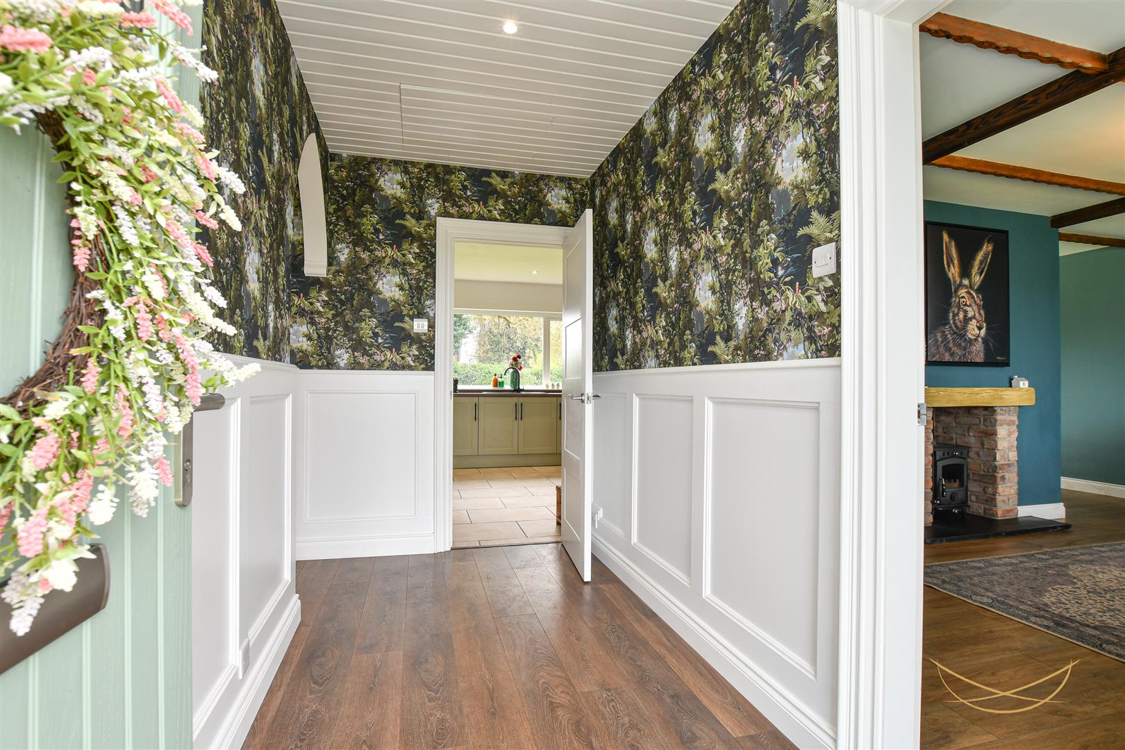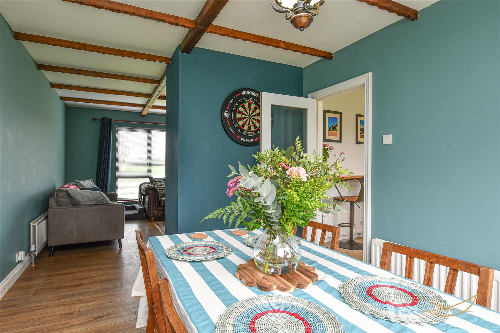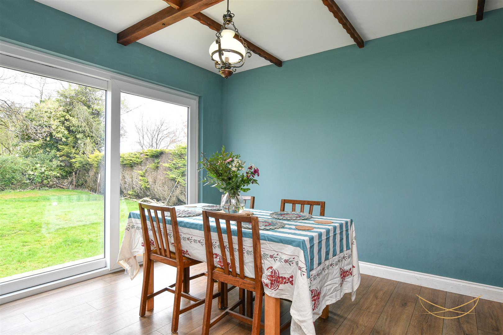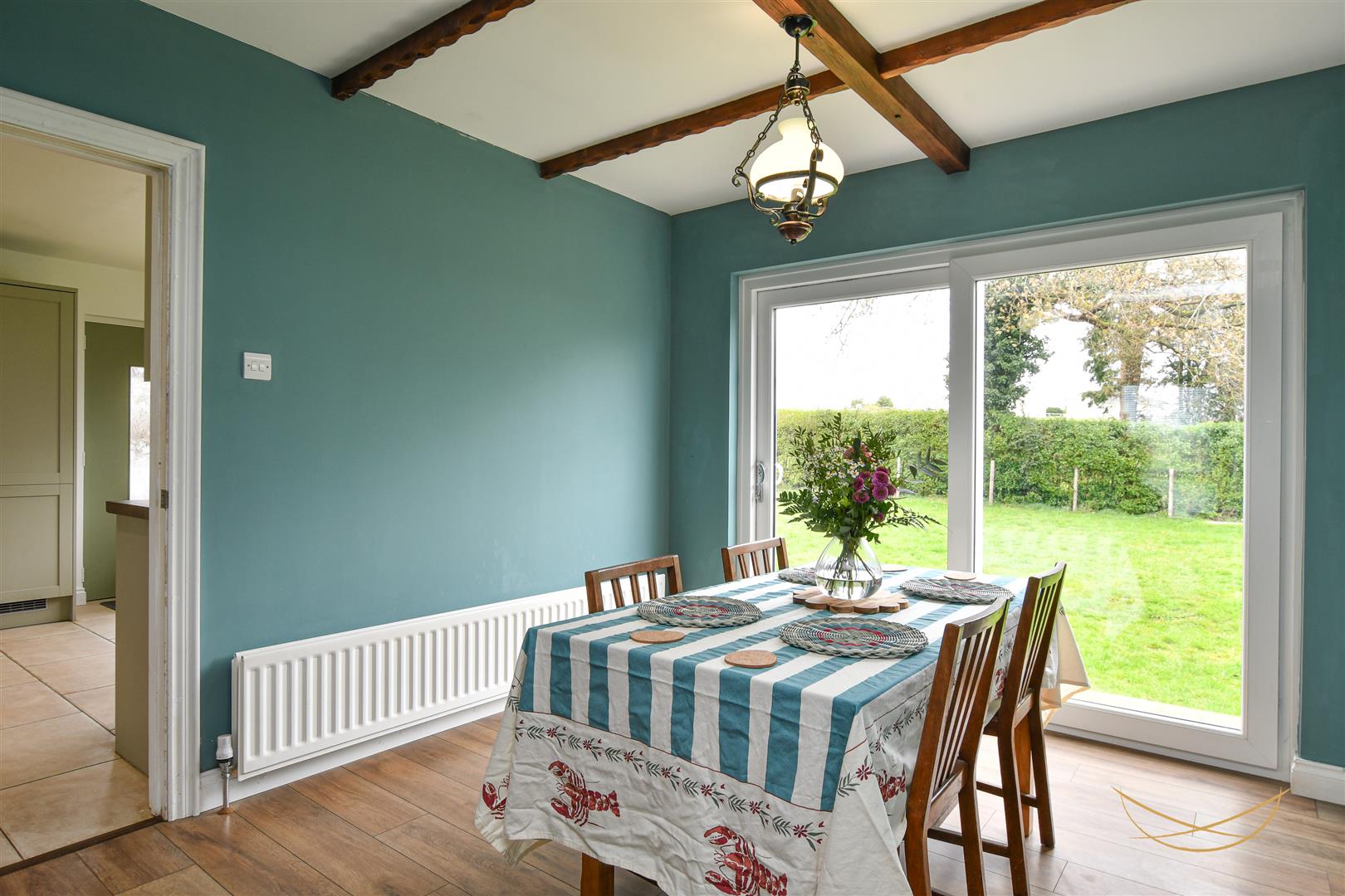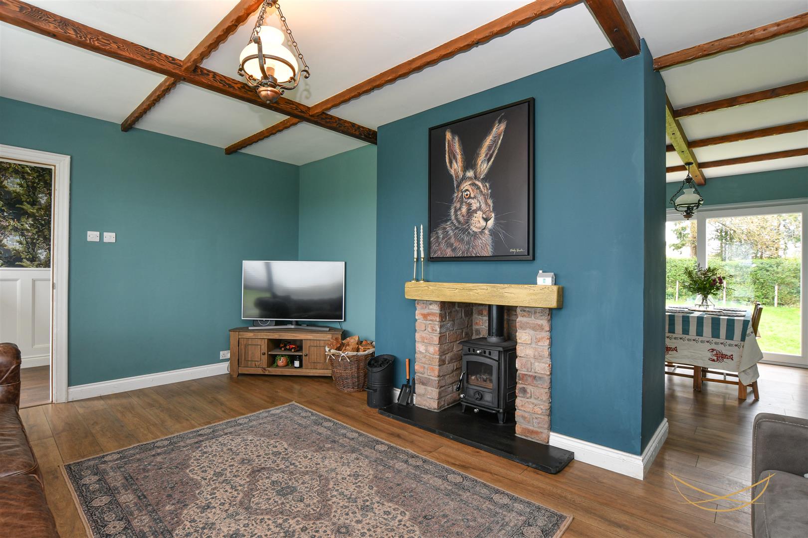 Laminate wood effect flooring. Exposed beams. Sliding door to rear garden.