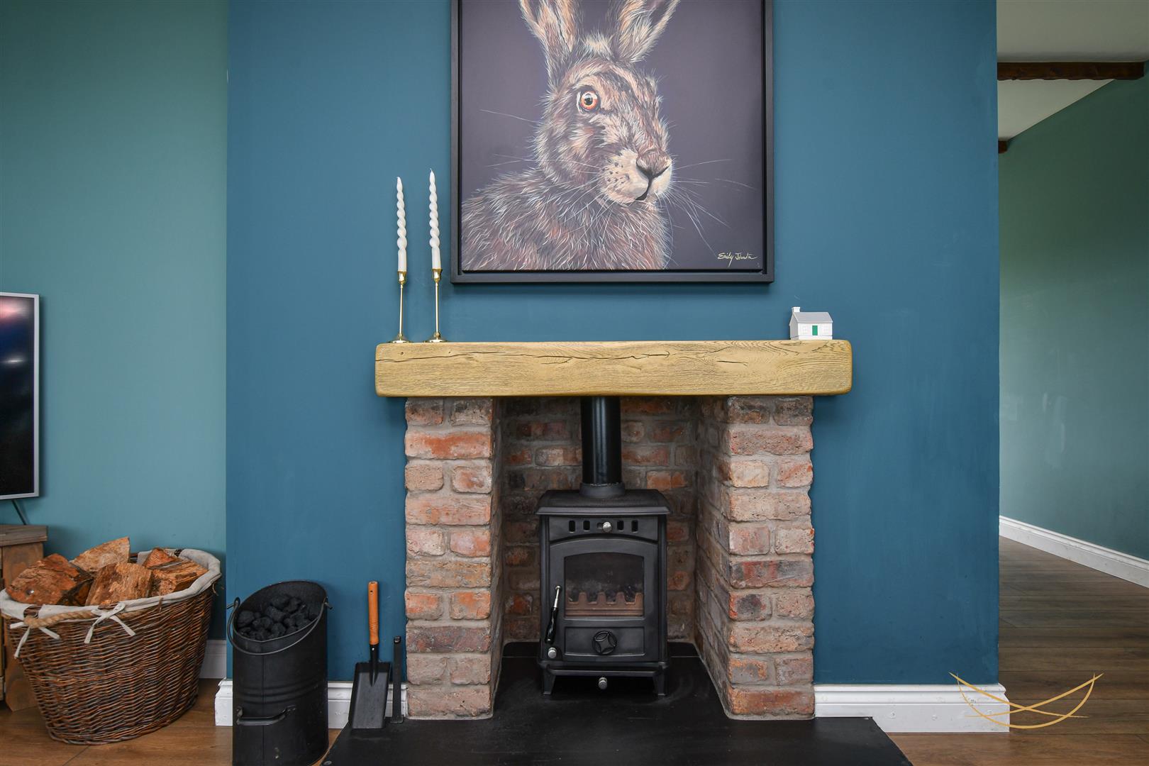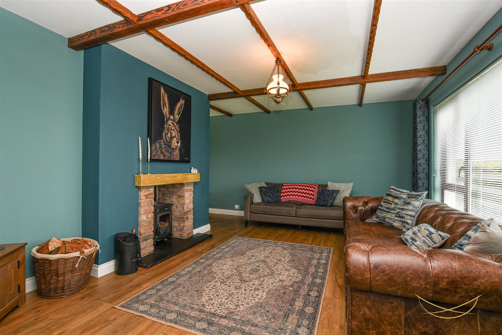Feature multi fuel burning stove with exposed brick surround, contrasting tiled hearth and over beam. Exposed beams. Laminate wood effect flooring.