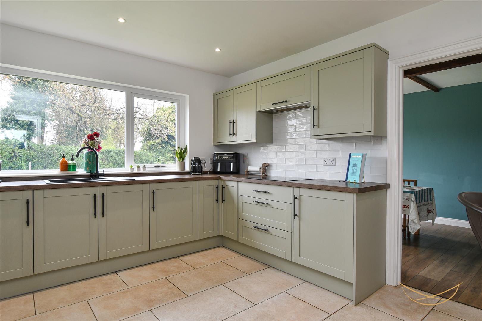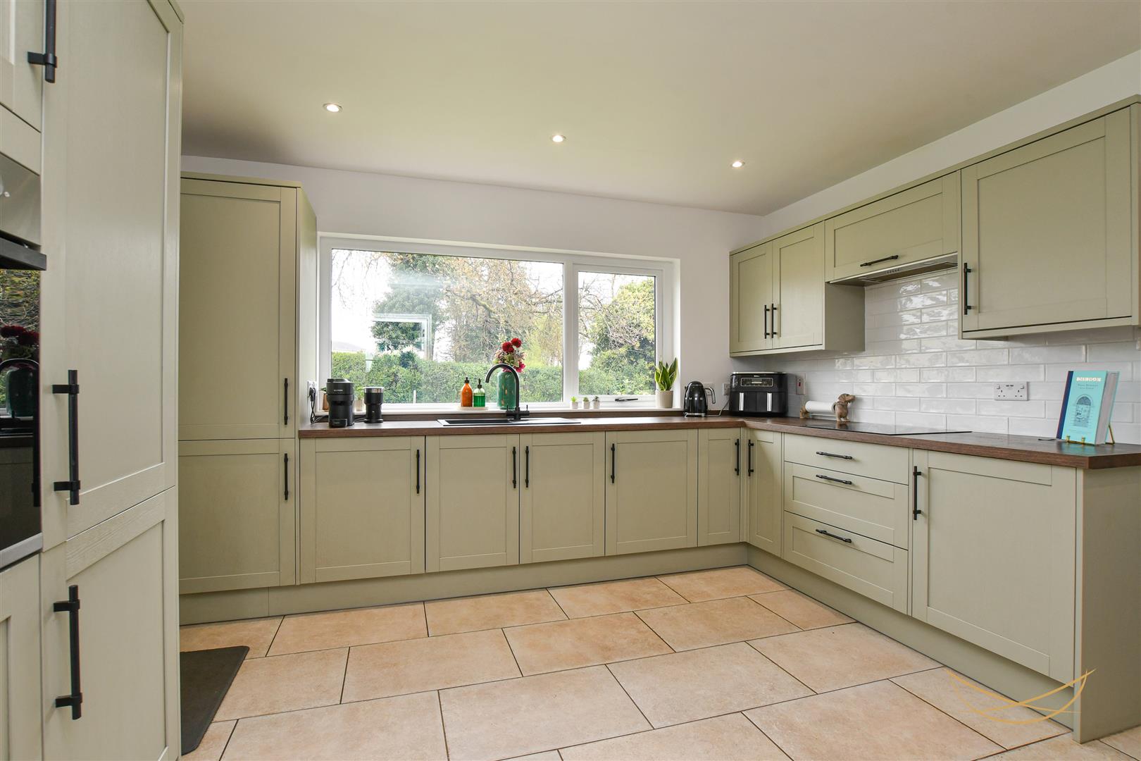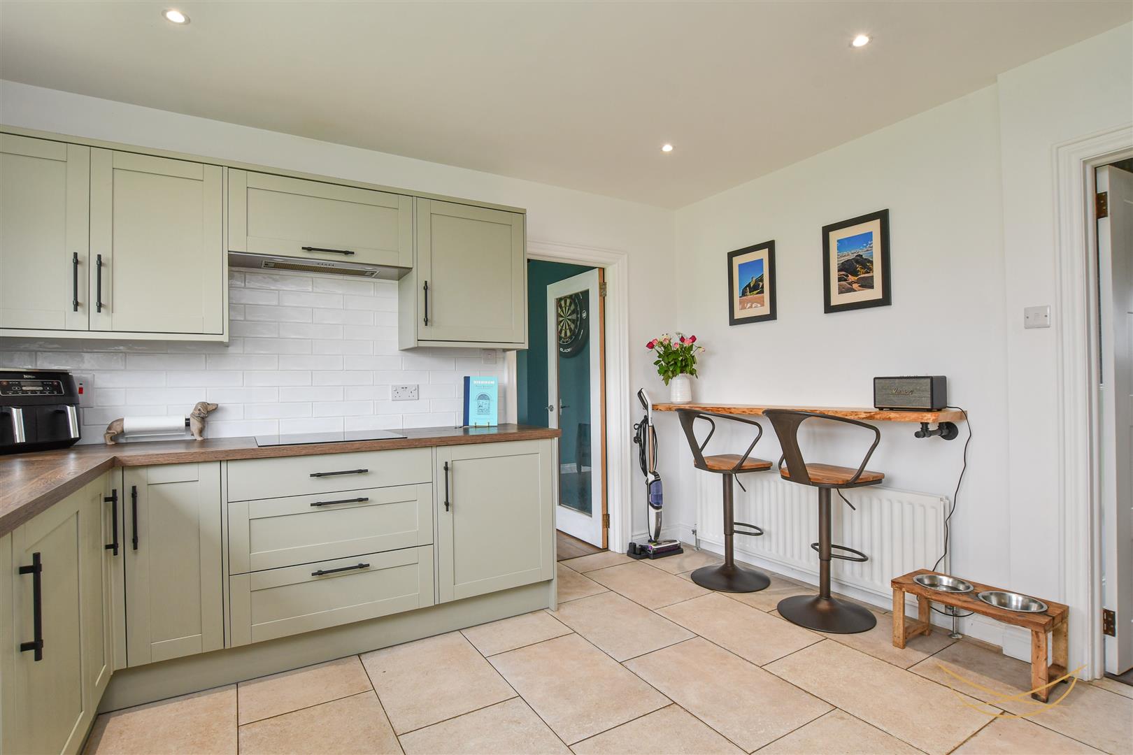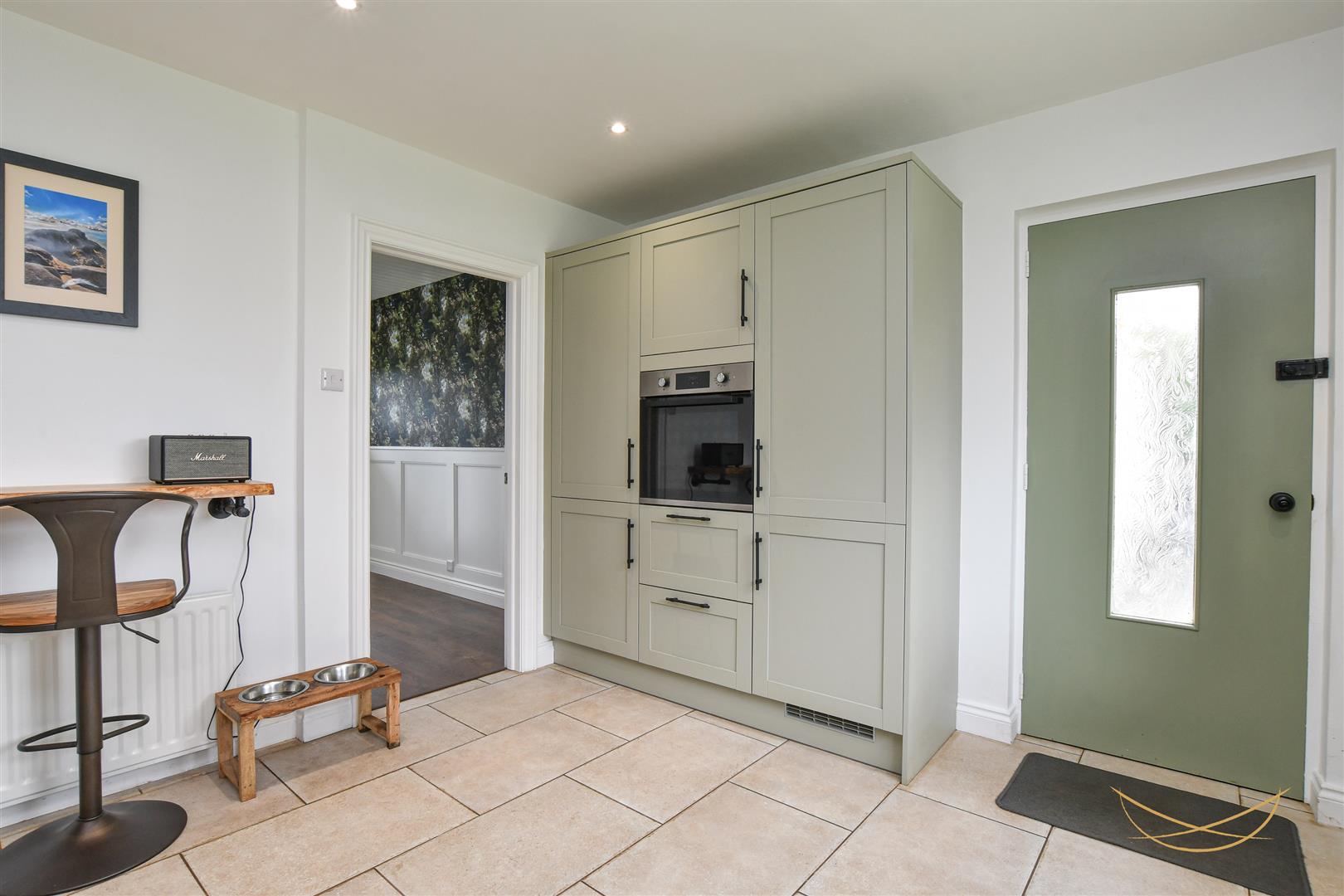 Shaker style kitchen with a range of high and low level units with contrasting worktops. Integrated fridge freezer. Integrated washing machine. Composite sink unit with drainer and mixer taps. Integrated Lamona hob. Integrated extractor fan. Eye level integrated oven and grill. Tiled splashback. Tiled flooring. Recessed spotlights. Breakfast bar area. Access to rear garden.