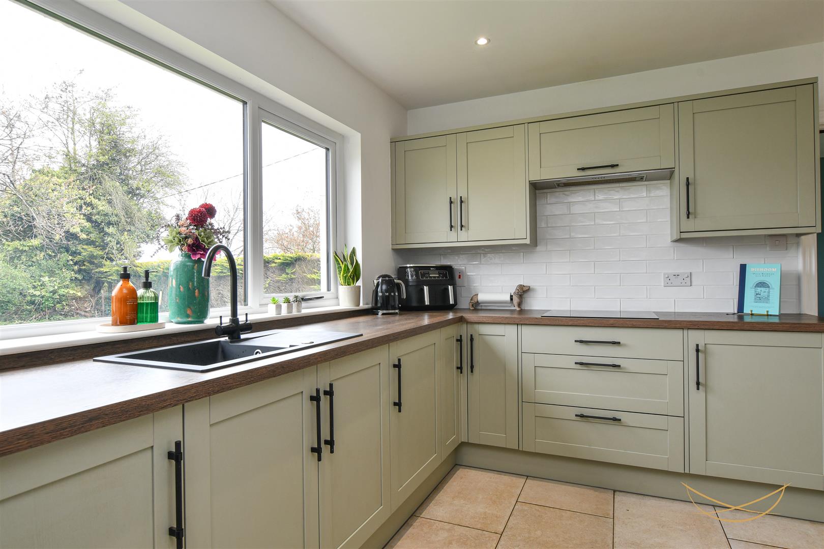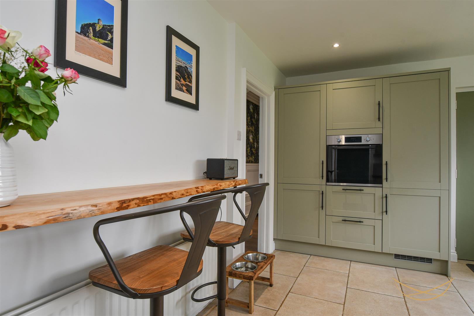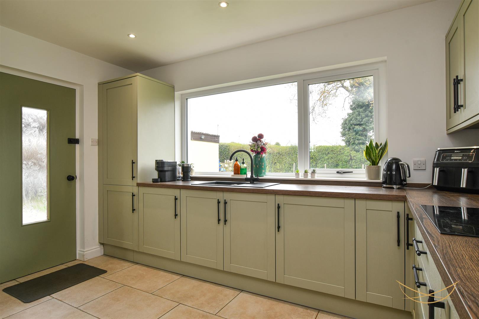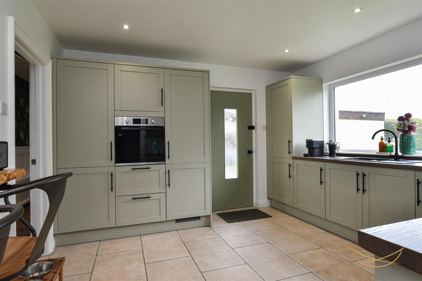 Shaker style kitchen with a range of high and low level units with contrasting worktops. Integrated fridge freezer. Integrated washing machine. Composite sink unit with drainer and mixer taps. Integrated Lamona hob. Integrated extractor fan. Eye level integrated oven and grill. Tiled splashback. Tiled flooring. Recessed spotlights. Breakfast bar area. Access to rear garden.