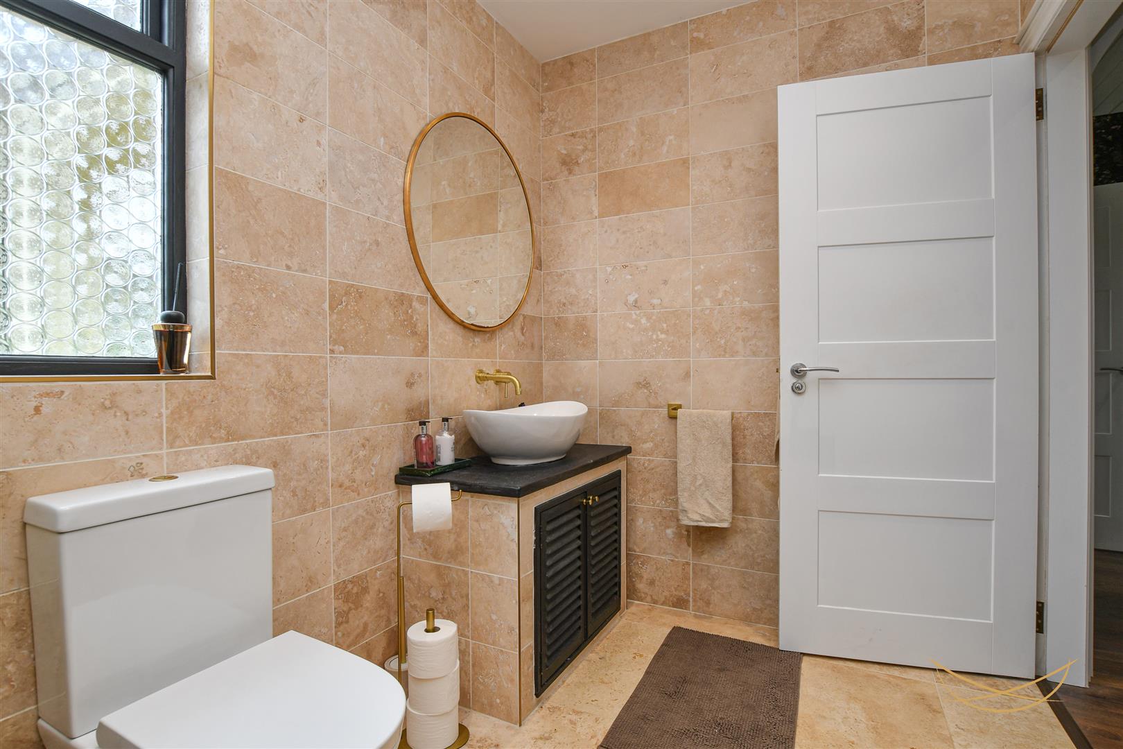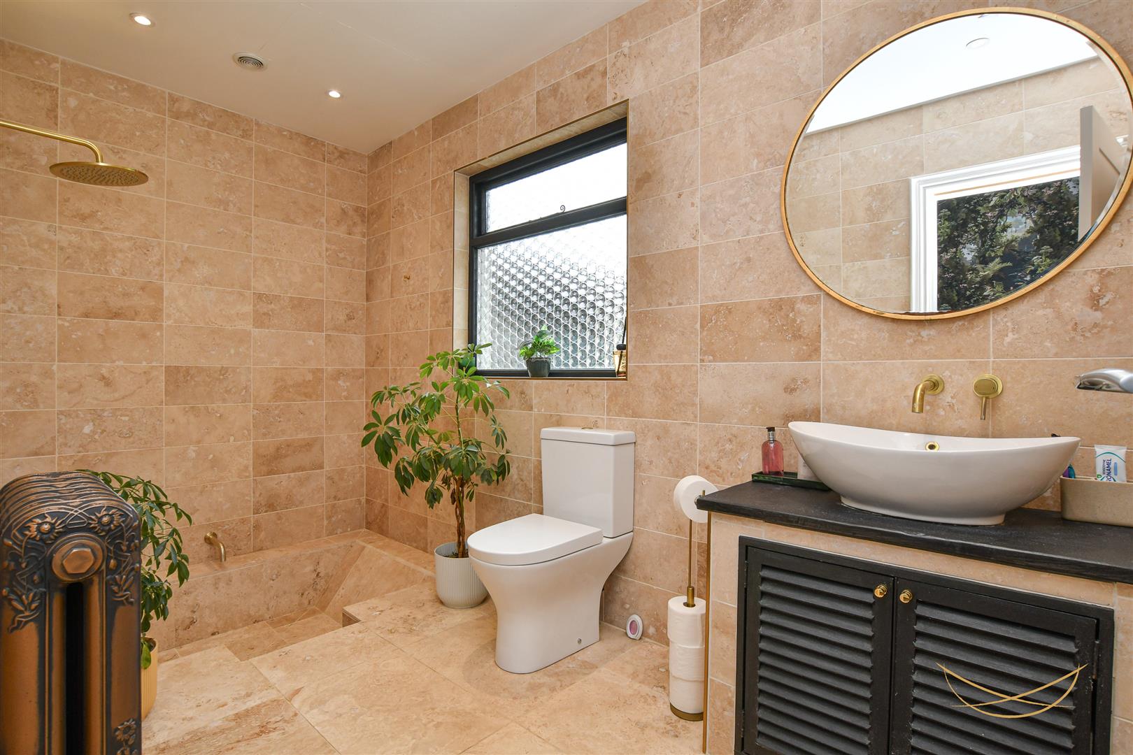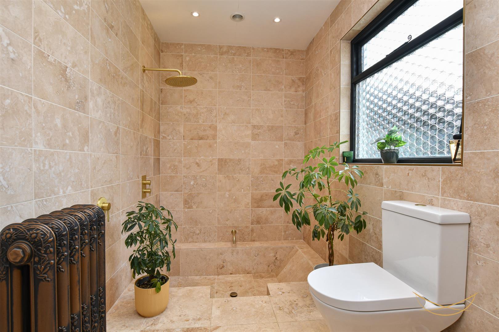 Contemporary floor recessed tiled bath with over head rainfall shower, brass taps and fittings. Vanity style sink unit with wall mounted mixer taps. Low flush W/C. Traditional column horizontal radiator. Tiled flooring. Tiled walls. Recessed spotlights.