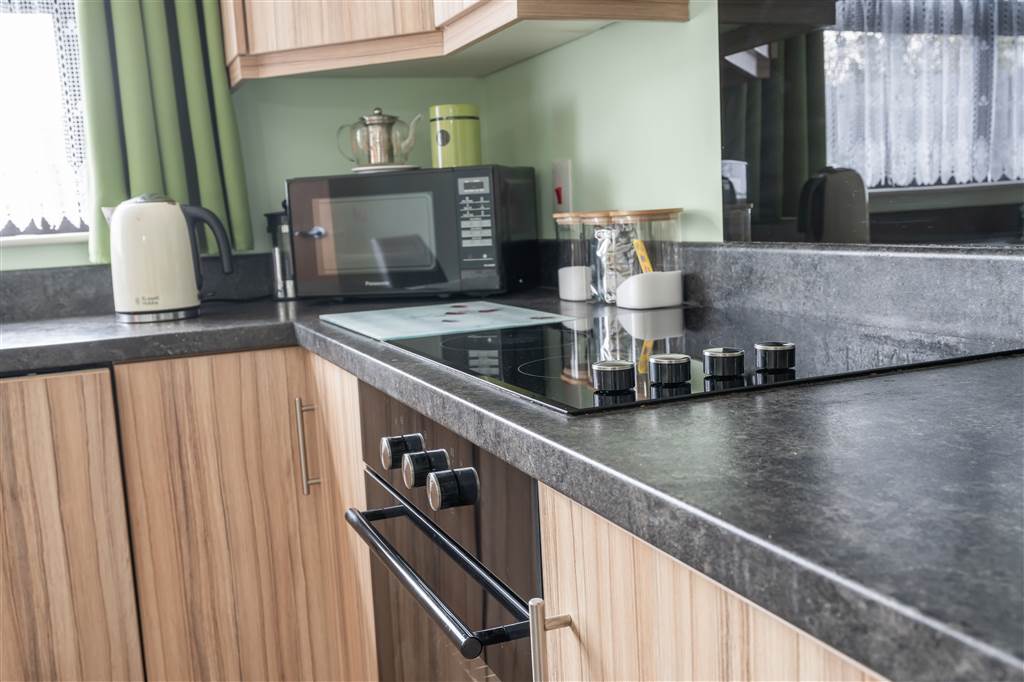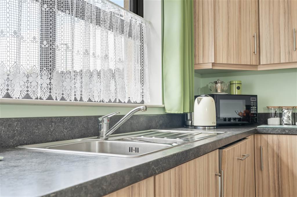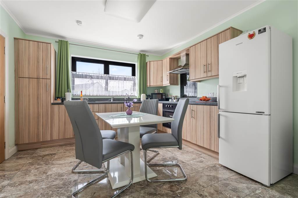 With a range of high and low-level fitted white units, 1 1/4 bowl stainless-steel sink unit and drainer with stainless-steel mixer tap. Integrated four ring electric hob and oven with extractor fan over. Space for fridge-freezer. Integrated dishwasher. Cutlery drawer. Saucepan drawers. Tiled flooring.