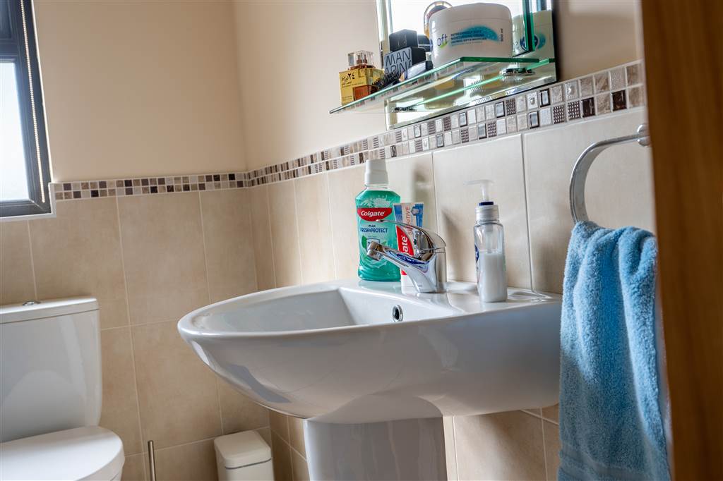 With 2-piece white suite comprising LFWC and WHB. Tiled flooring.