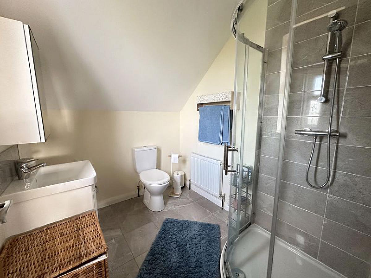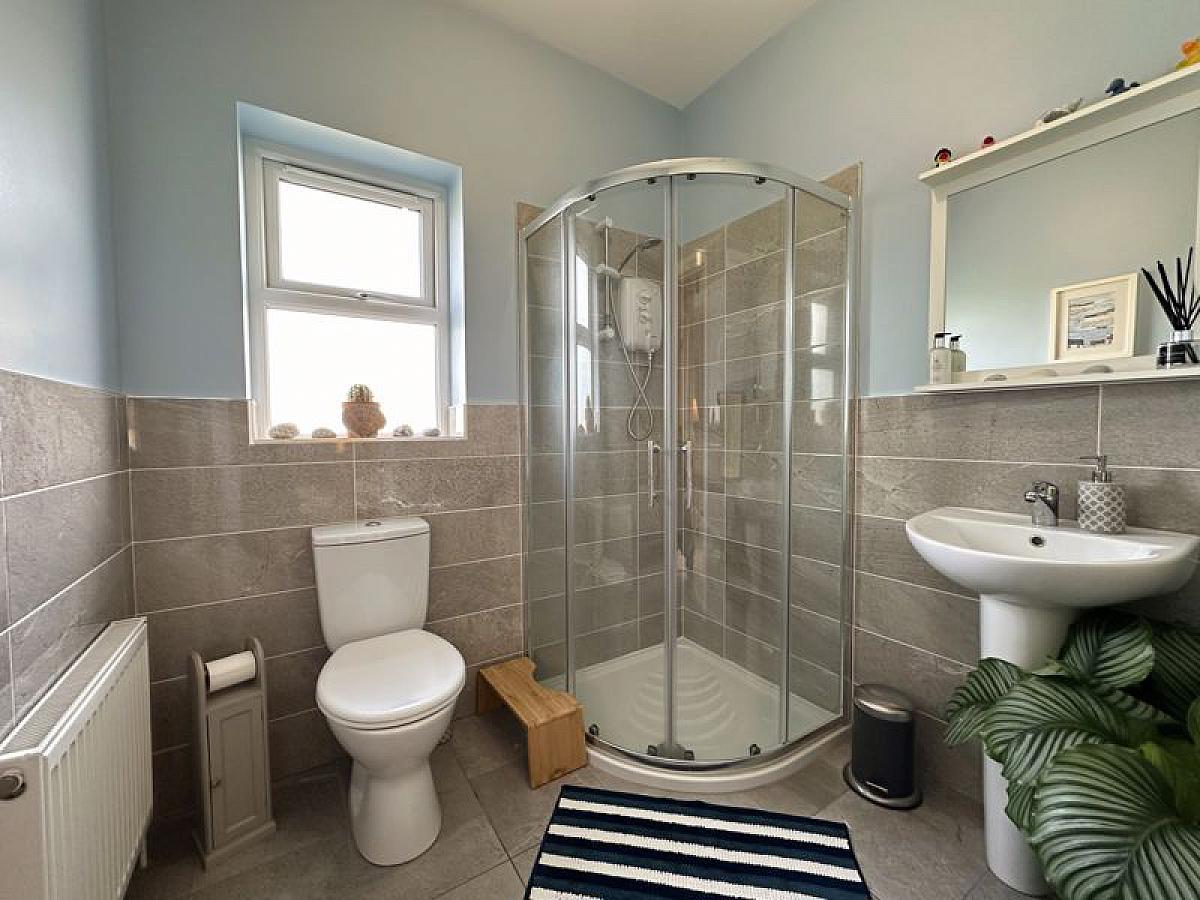 White suite comprising low flush WC, wash hand basin with mixer tap and tiled quadrant shower cubicle with Triton electric shower unit, 1/2 tiled walls, fully tiled floor, 1 radiator.