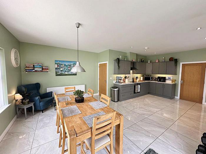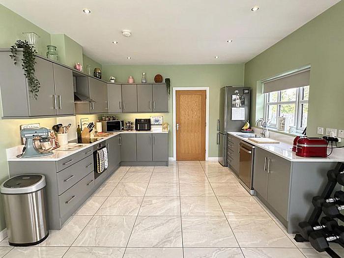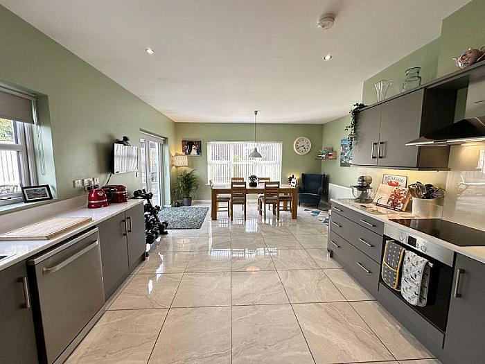 Full range of high and low level fitted modern units incorporating stainless steel sink unit with mixer tap and worktop lighting. Built-in oven and ceramic hob with glass splashback and stainless steel extractor hood with light, fridge/freezer space and plumbing for a dishwasher. Fully tiled floor, recessed ceiling spots to kitchen area, PVC double glazed double doors to patio, double radiator.
