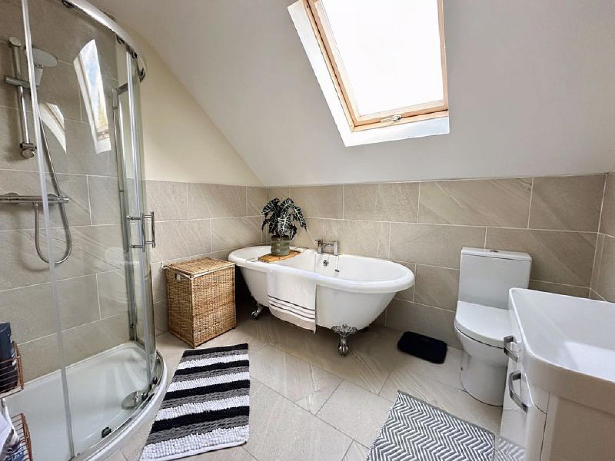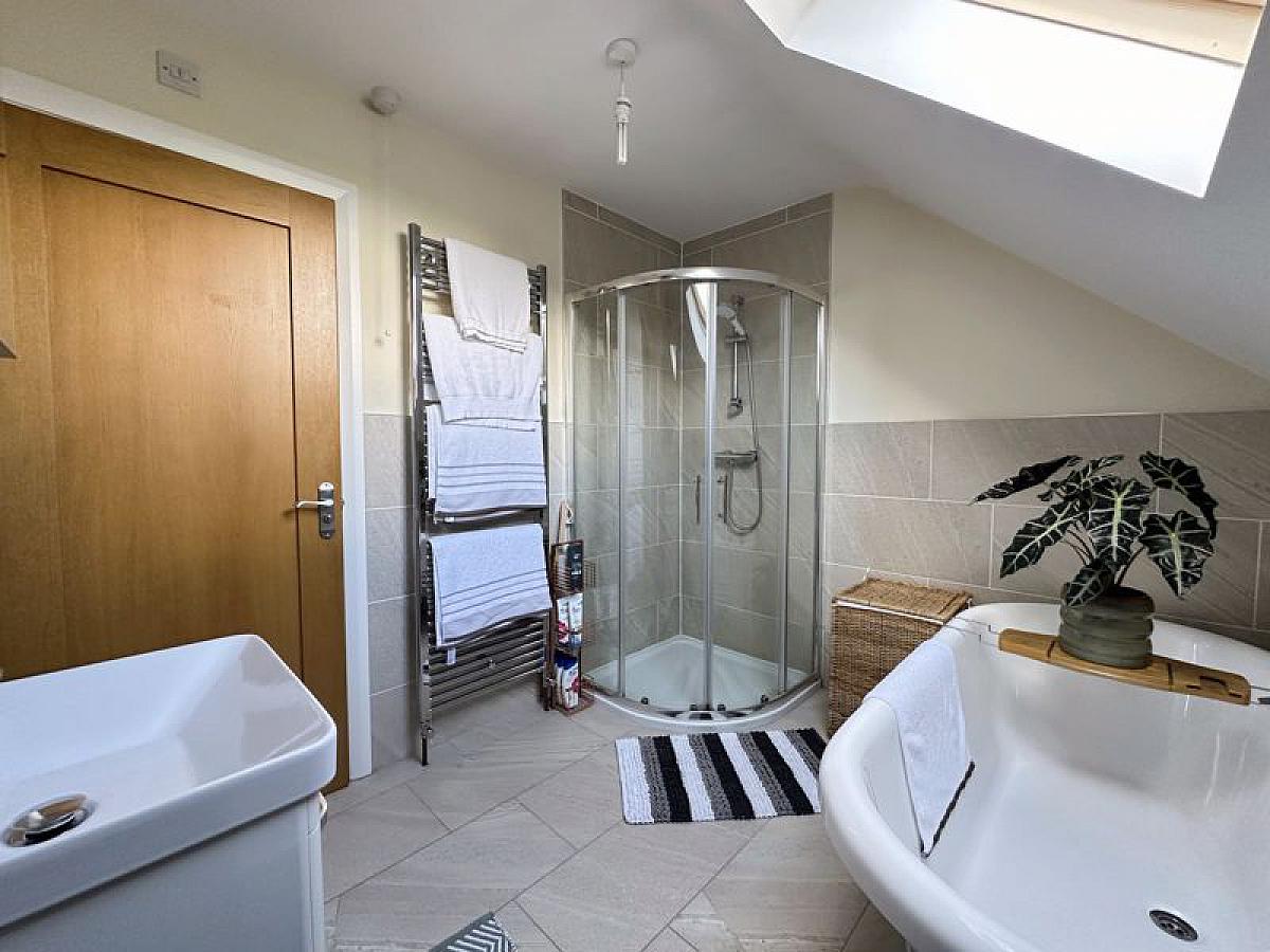 White suite comprising low flush WC, vanity unit with wash hand basin and mixer tap, freestanding bath with centre mixer tap and fully tiled quadrant shower cubicle with thermostatic mixer shower, 1/2 tiled walls, fully tiled floor, double glazed window, heated chrome towel rail.