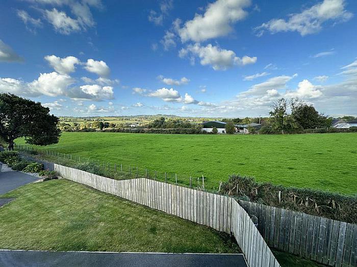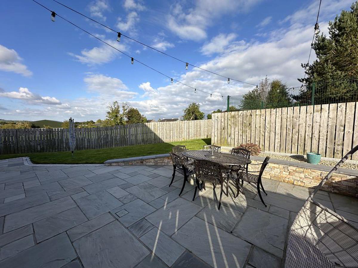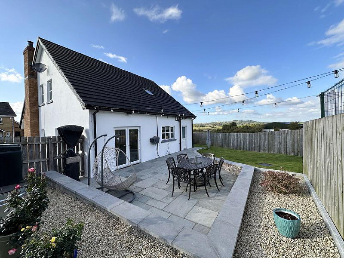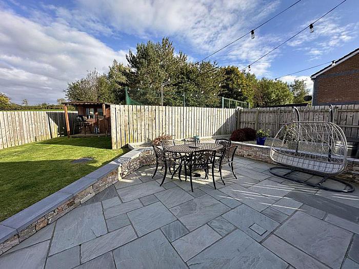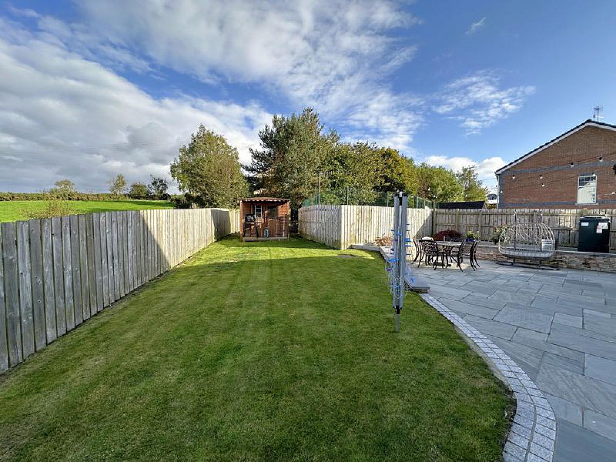 Lawn and pebbled front/side gardens with tarmac driveway and parking bay, electric vehicle charging point. Fully enclosed private rear garden with feature natural stone patio and walling, garden in lawn with open countryside aspect, pebbled shrub bed, garden shed, outside lighting and water tap.