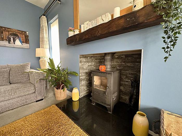 Feature cast iron multi-fuel stove with tiled inset, granite hearth and floating beam mantel, TV aerial lead, telephone point, bay window, double radiator.