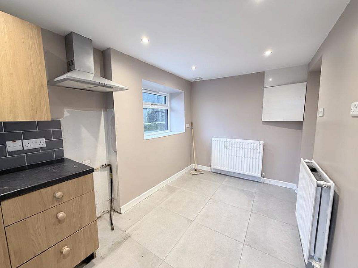 Fitted high and low level units with single drainer stainless steel sink unit and mixer tap, cooker space with extractor hood, fridge/freezer space, tiled floor, recessed ceiling spots, double radiator.