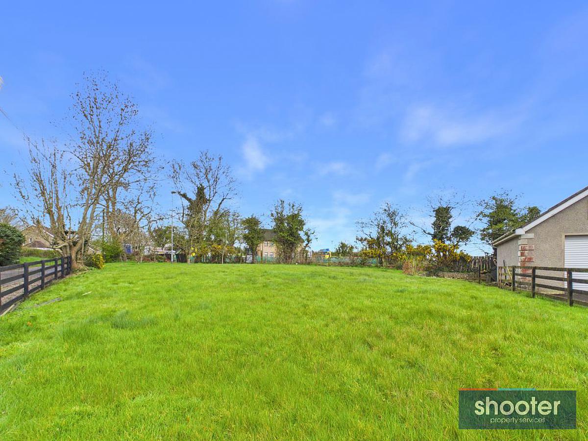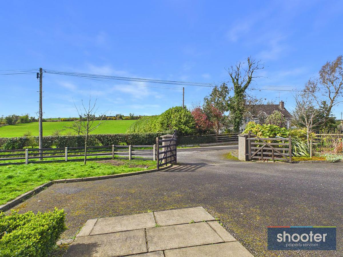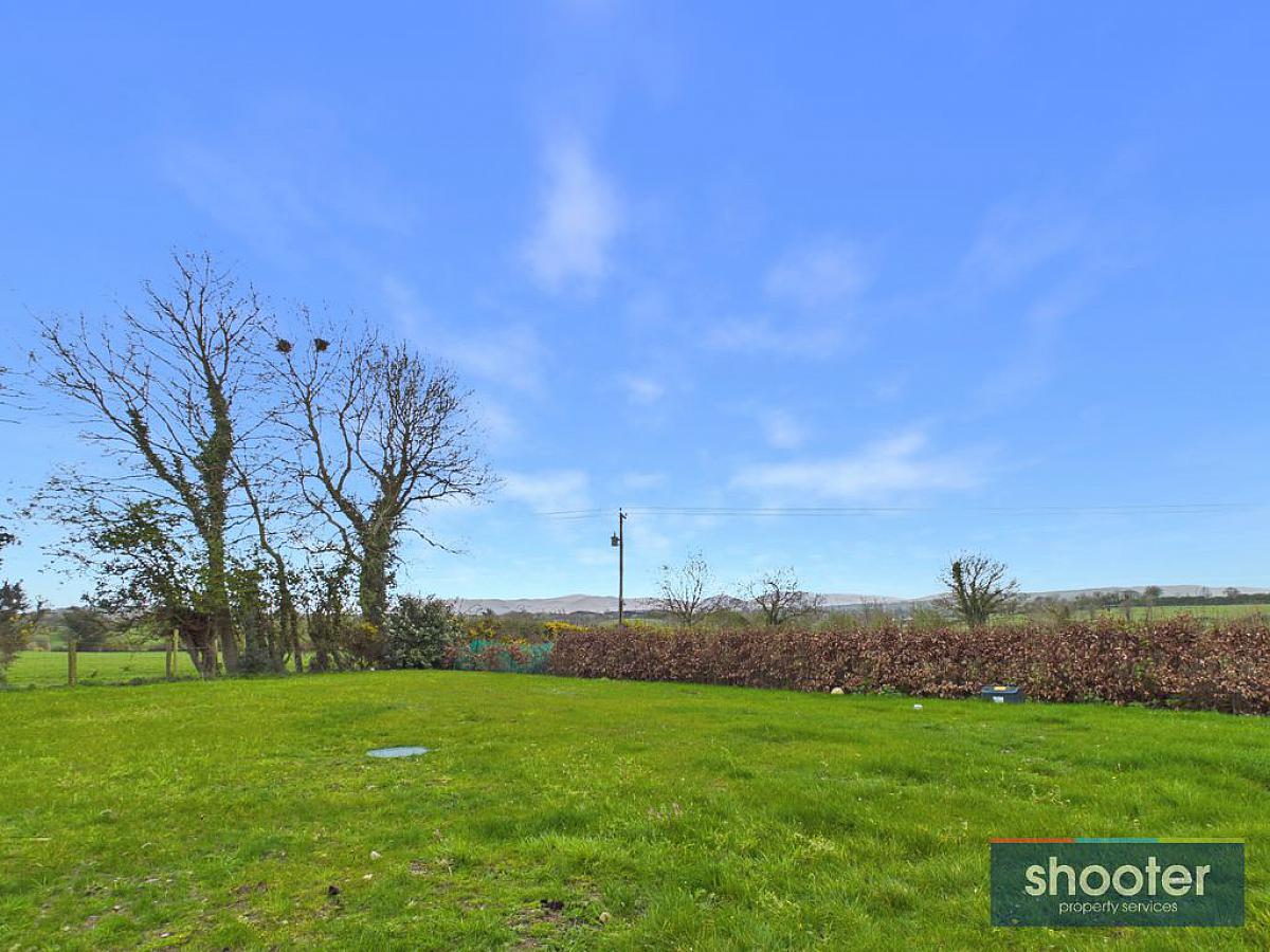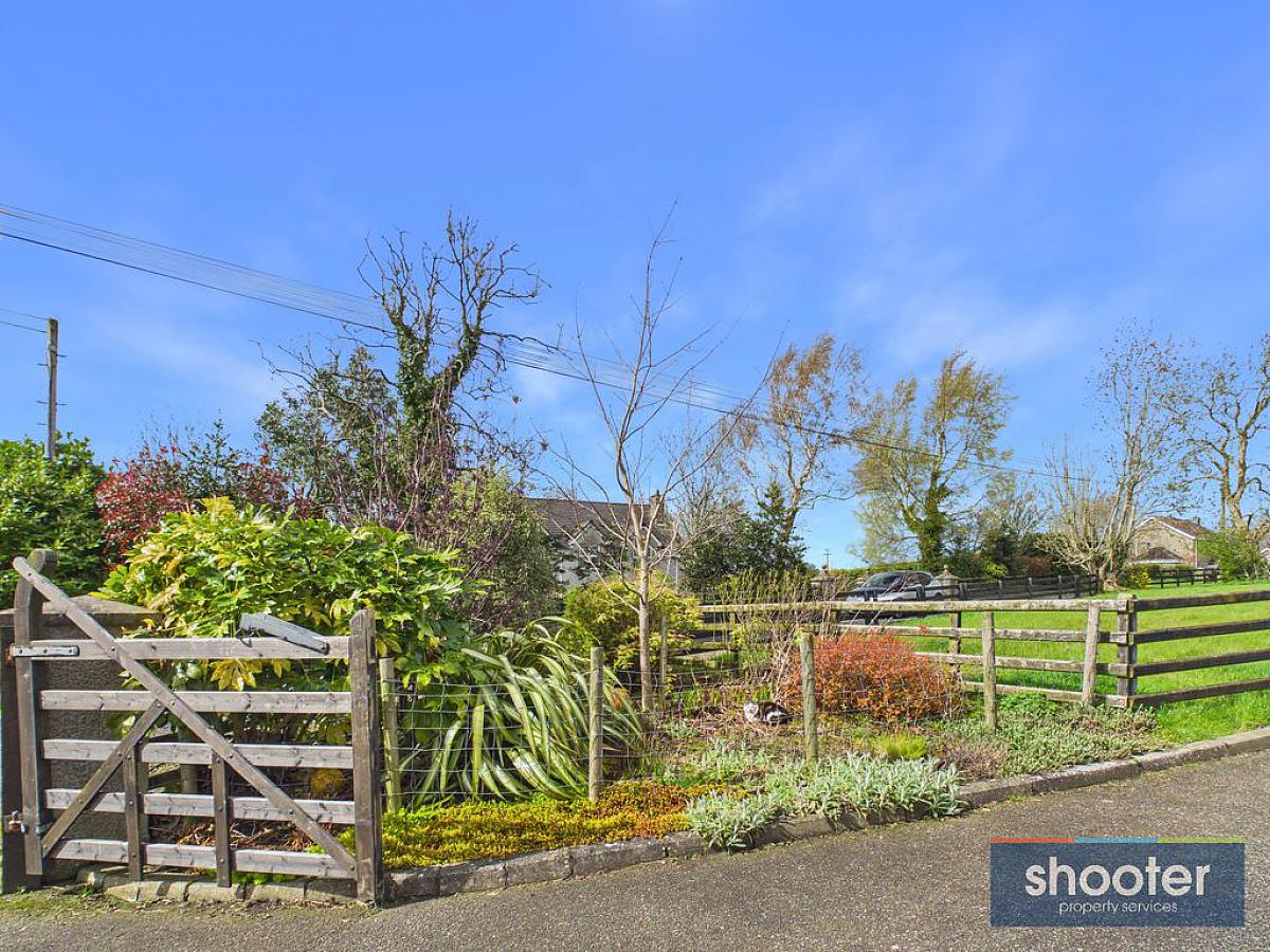 Concrete pillar entrance with wooden gate and fence boundary. Large tarmacadam driveway with parking to front, side and rear. Paved porch entrance with light and large grass lawn to front. Large grass paddock to the side. Concrete rear patio with outside light, water tap and washing line. Large grass lawn with paved patio area and fenced off planting area.
