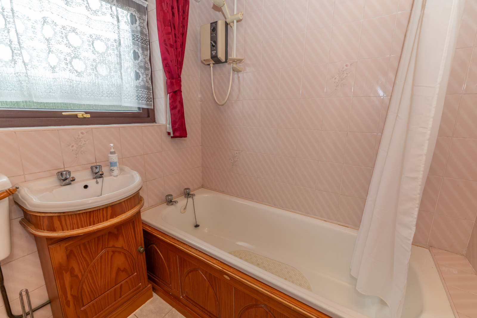 Fully tiled walls and floor, comprising a white suite with WC and wash hand basin set within a vanity unit. Bath with wood panel surround and Triton electric shower.