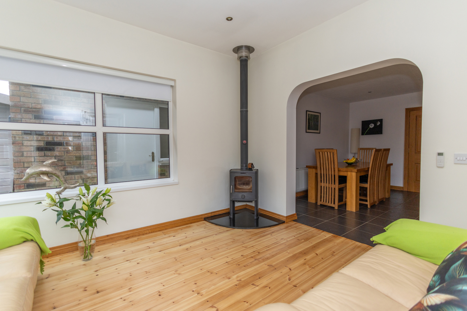 Pine flooring. Recessed lighting. Multifuel stove. Door to the rear of the property.
