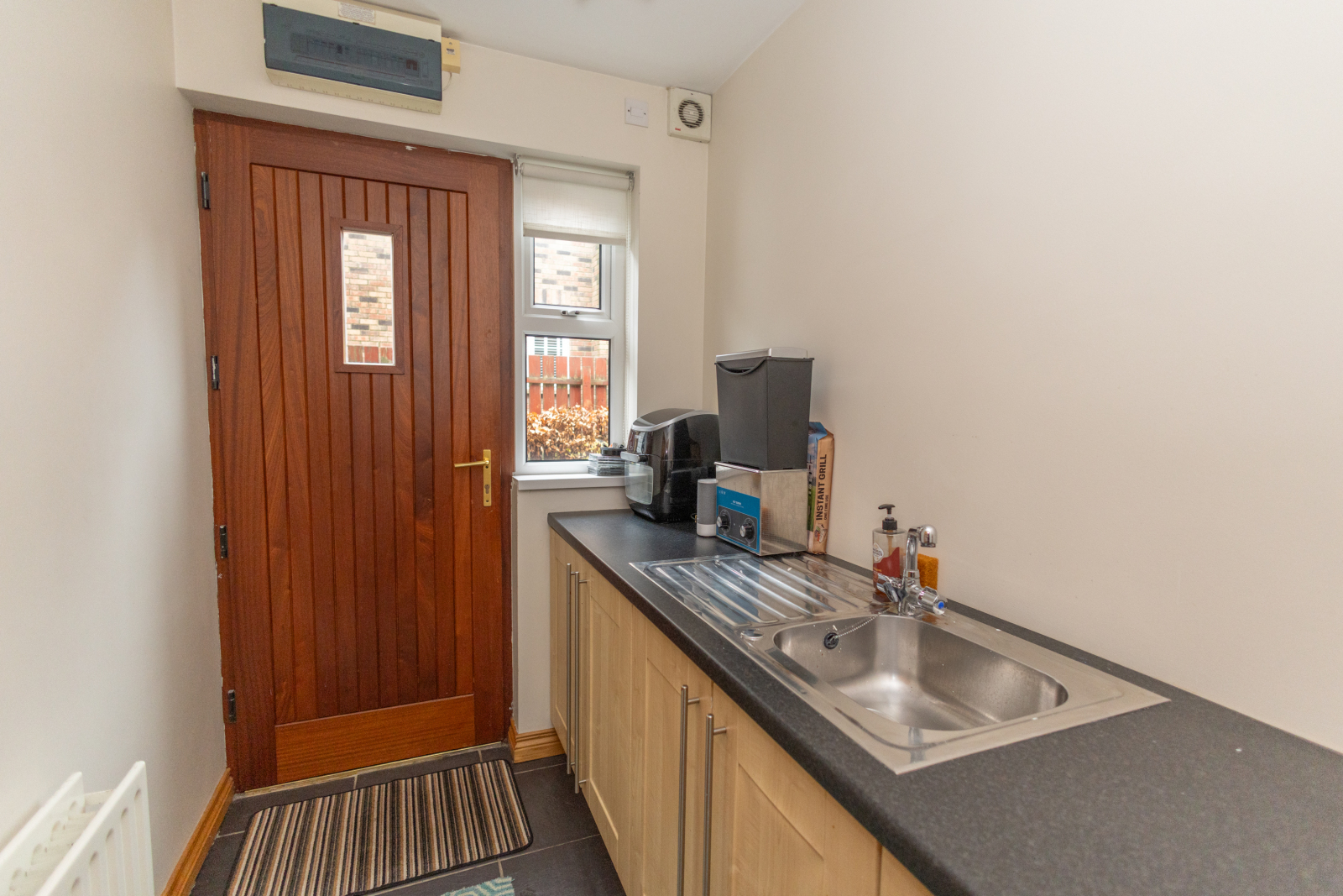 Tiled flooring. Built in units with counter top and stainless steel sink and mixer tap. Solid wood external door.