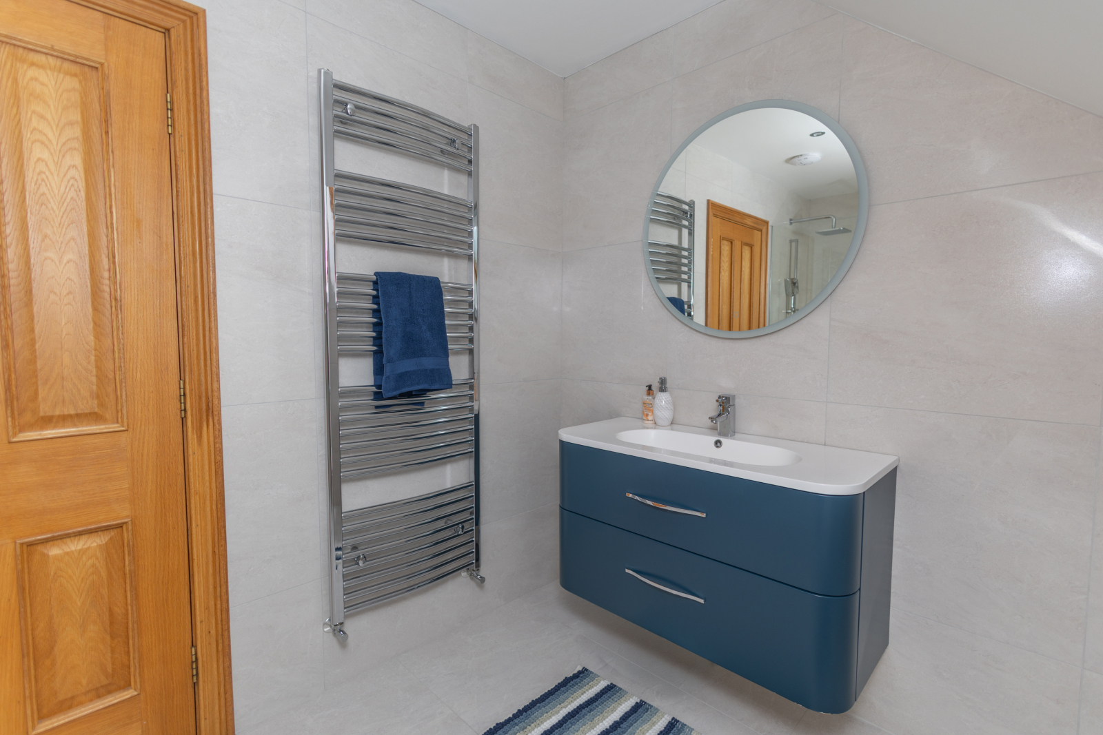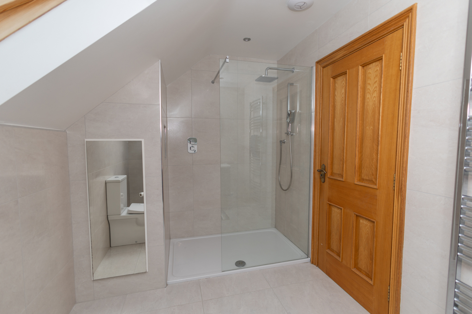 Tiled flooring. Fully tiled walls. Recessed lighting. Sink with chrome mono tap and vanity unit. Low flush wc. Wall mounted chrome radiator. Rainfall thermostat shower with glass surround.