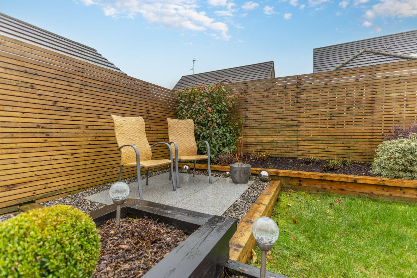 The rear of the property features a landscaped garden, designed for easy upkeep and everyday use. A detached garage provides further storage or workspace options.