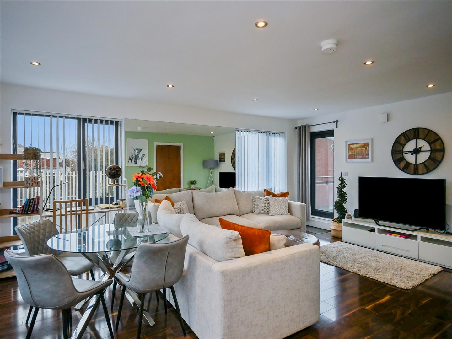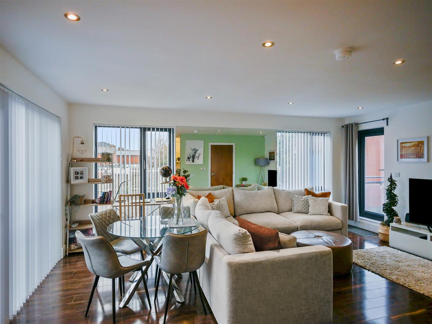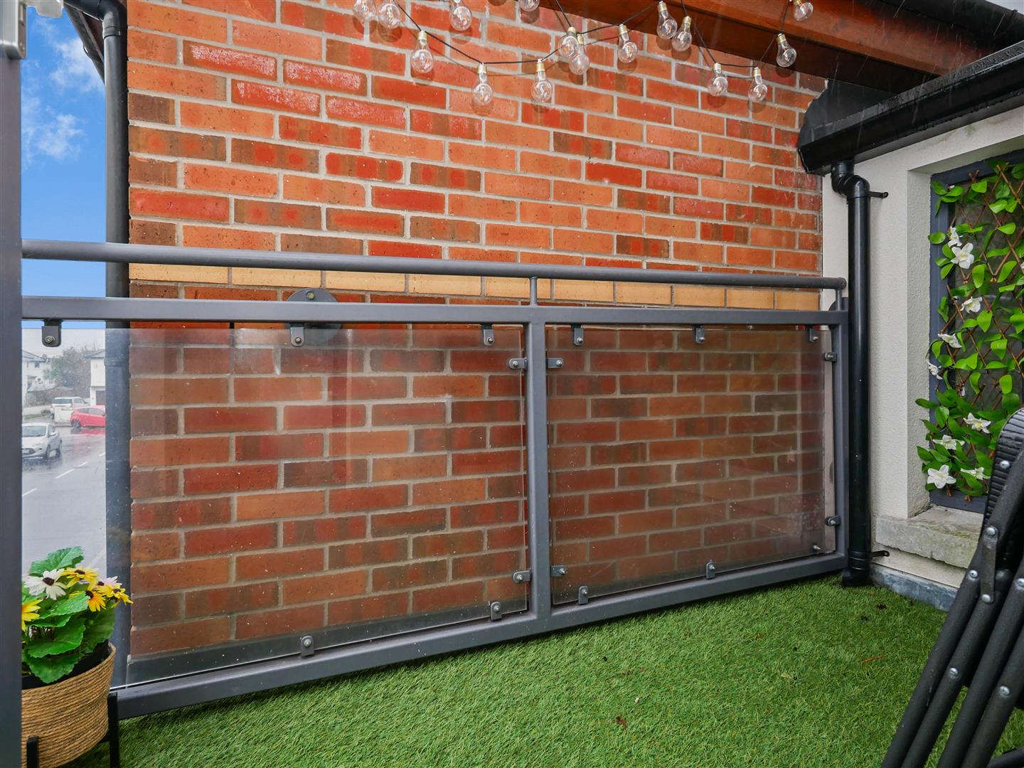 Laminate flooring. Spot-lights. Three large windows flood the area with natural light. Glazed door provides access to balcony finished with artificial grass.