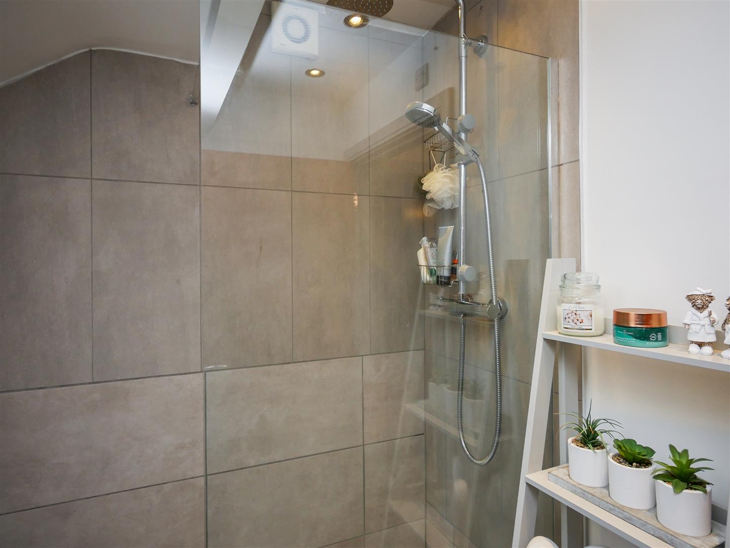 Comprising walk in shower unit with chrome shower unit with drench head shower, glazed partition, pedestal wash hand basin, low flush w.c Fully tiled walls, tiled flooring. Heated chrome towel rail.