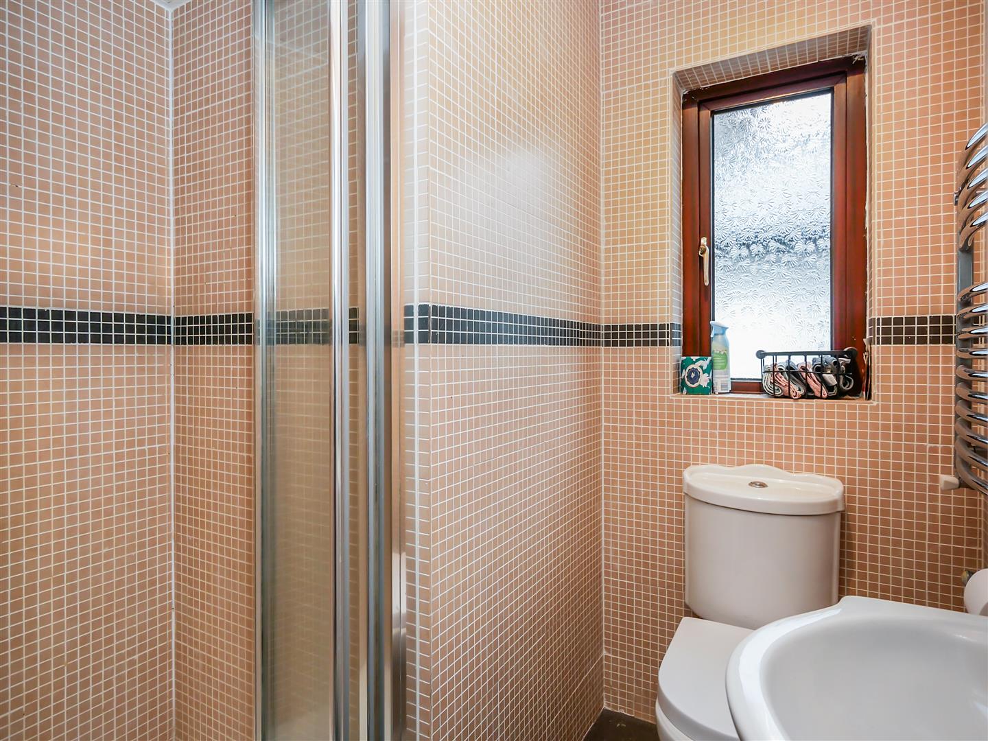 Comprising shower cubicle with shower unit with chrome shower attachment, wash hand basin with storage below, low flush w.c Fully tiled walls. Tiled flooring. Heated chrome towel rail. Laminate flooring.