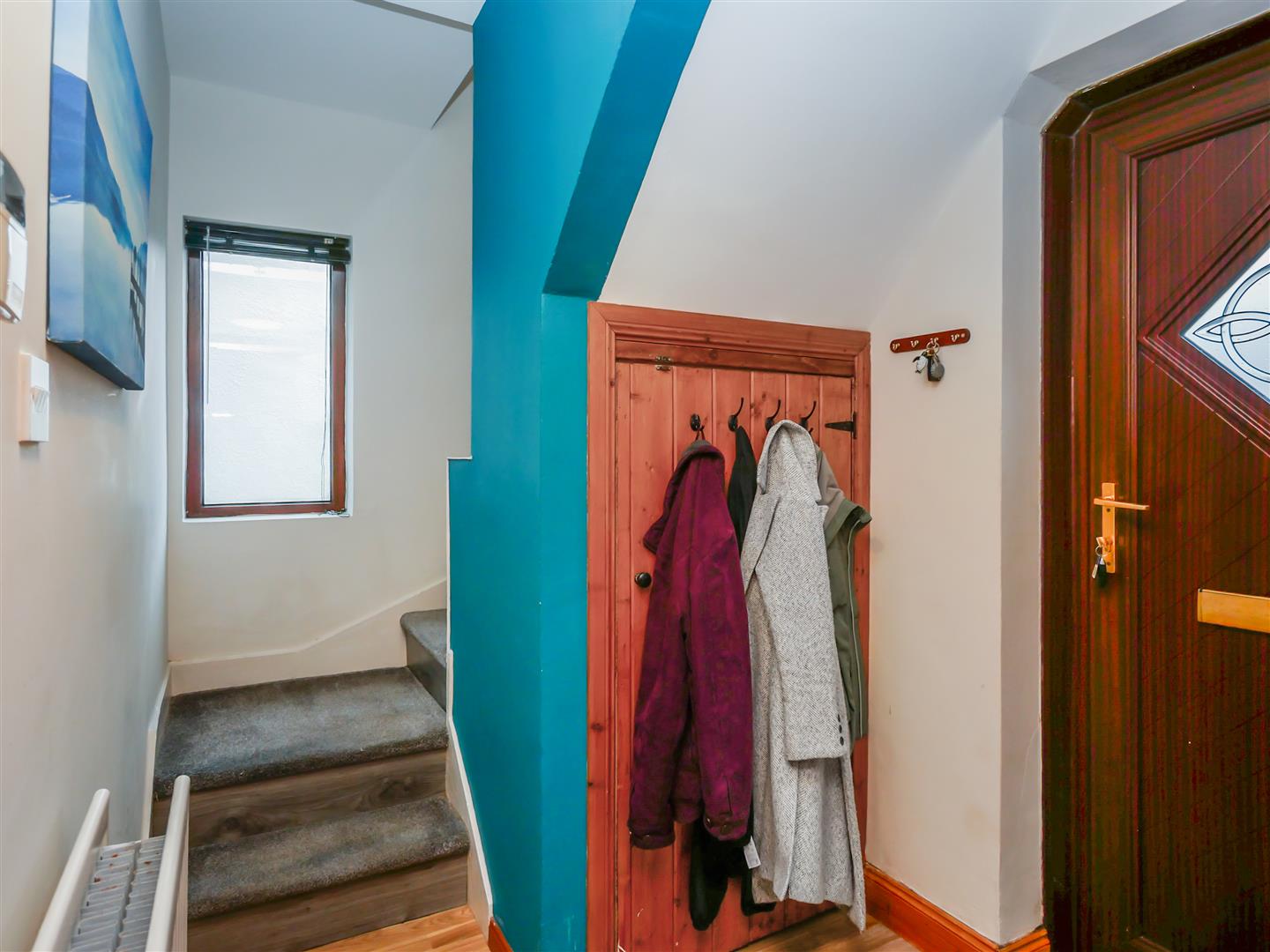 Pvc glass panelled front door to entrance hall. Under stairs storage.