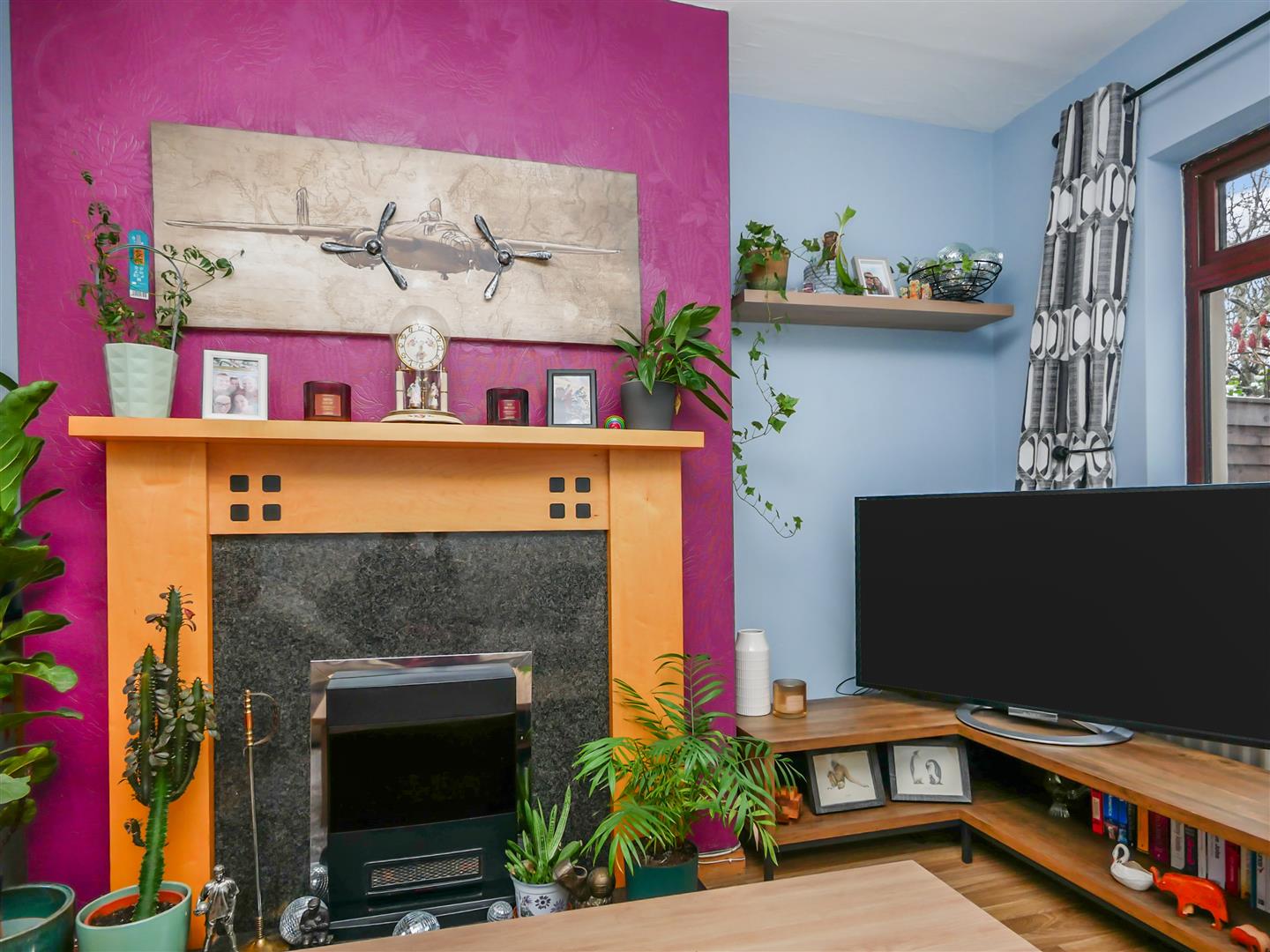 Cast iron fireplace with wooden surround. Laminate flooring.