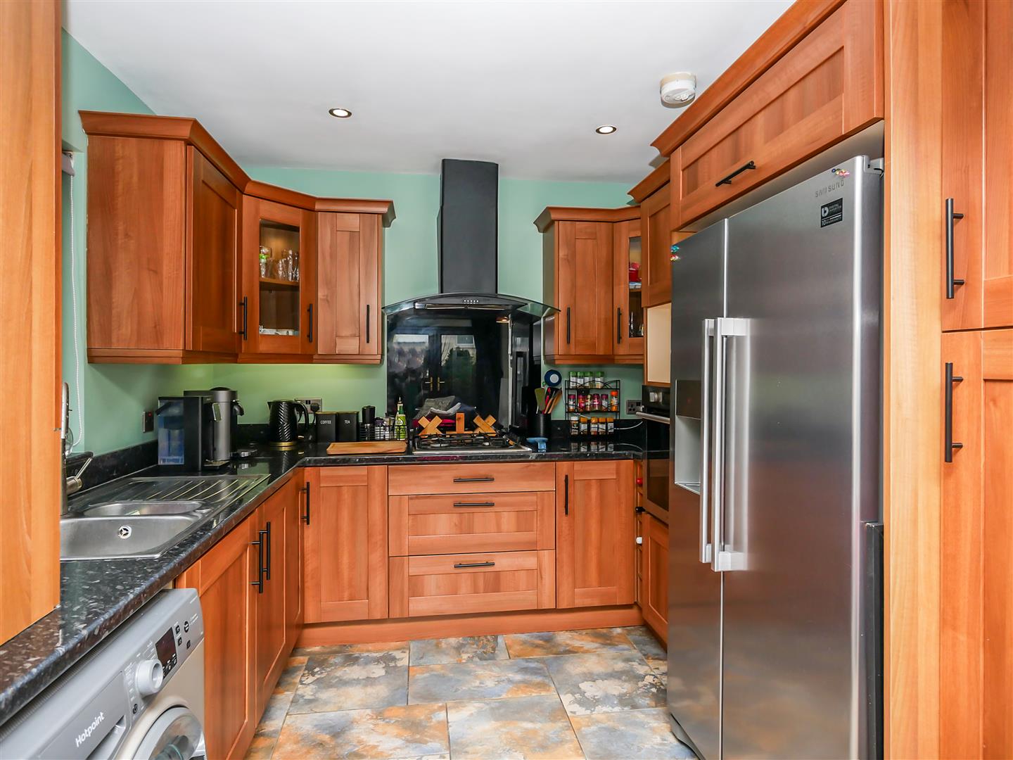 Full range of high and low level units, glazed cabinets, built in hob and eye level oven, overhead extractor fan, plumbed for washing machine, plumbed for American fridge freezer. Tiled flooring.