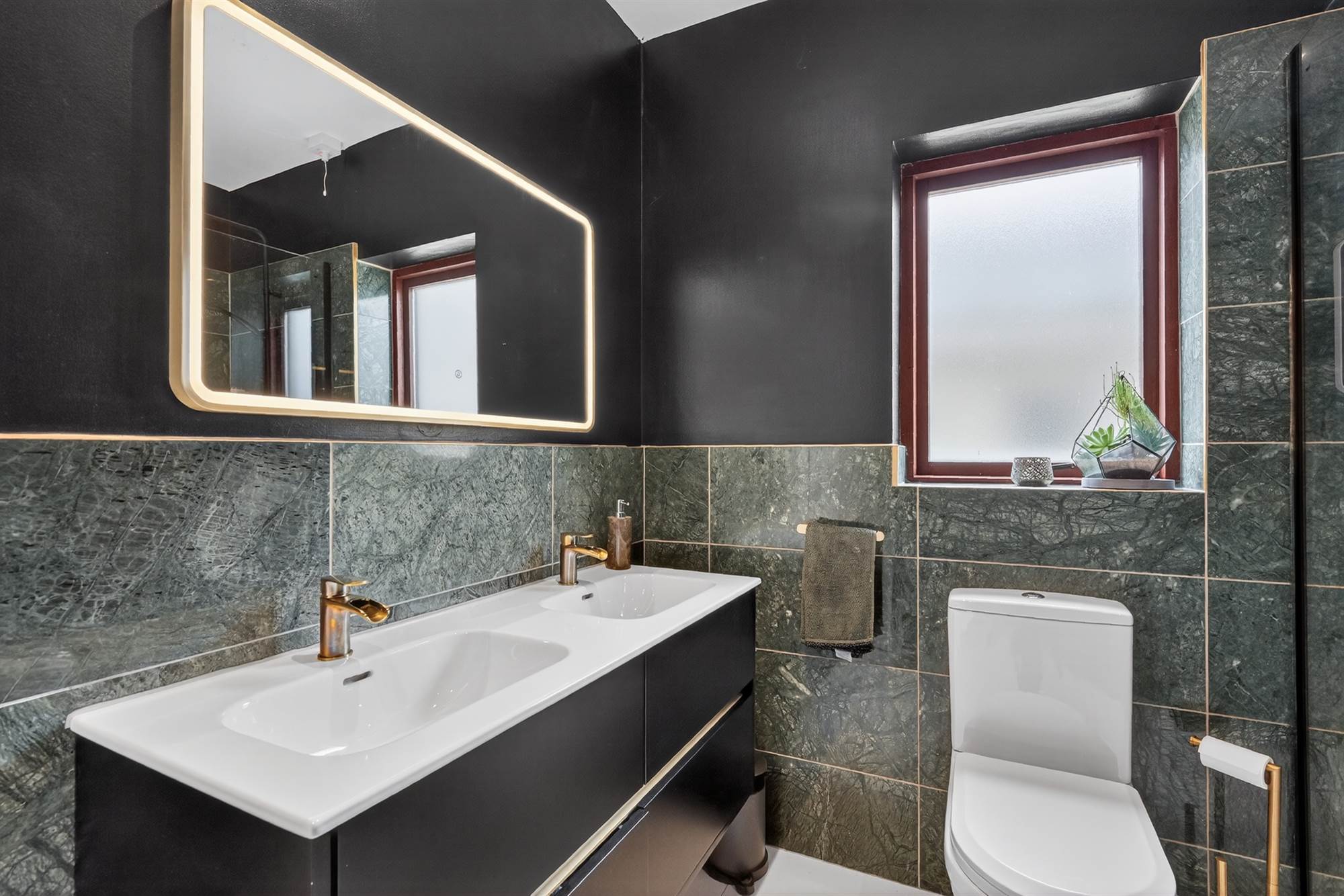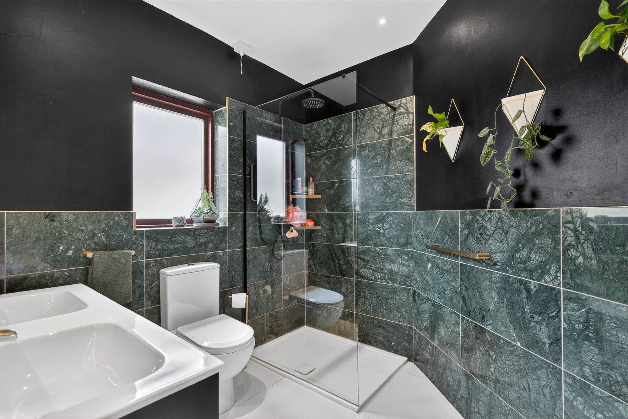 White suite comprising dual flush wc, twin vanity unit with ceramic sinks. Walk-in shower cubicle with matt black rainhead shower, matt black heated towel rail, wall-mounted mirror. Porcelain tiled floor, marble tiled walls, spotlights.