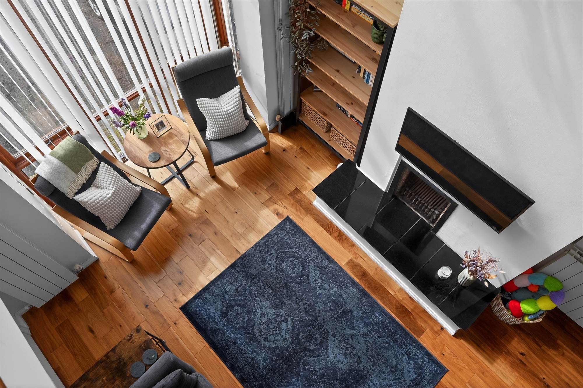 Solid wooden flooring, storage cupboard. Feature fireplace with open fire and tiled hearth. Uplighters. Feature vertical radiators. Spotlights.