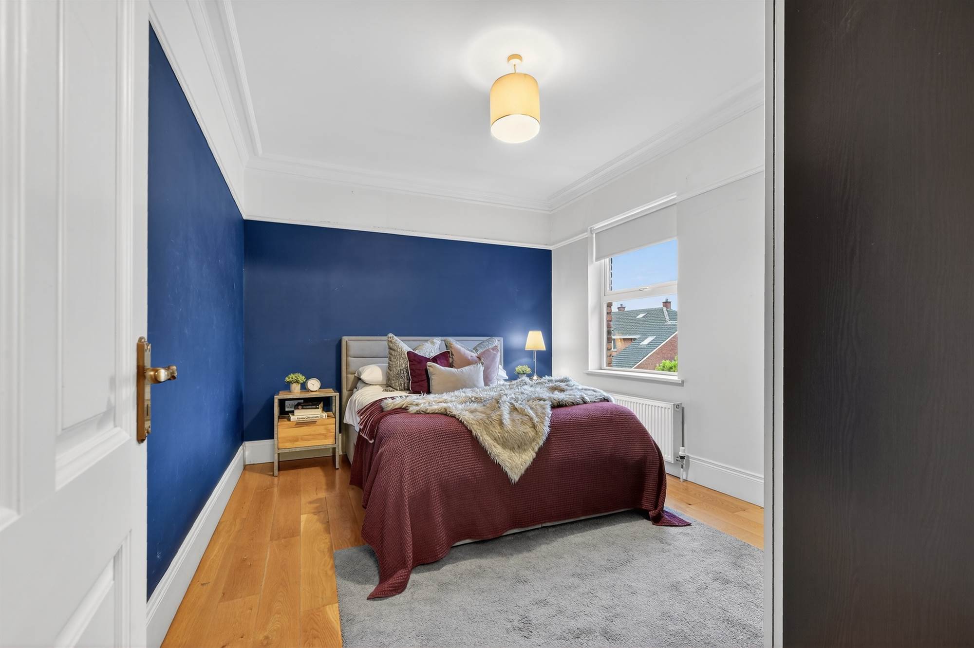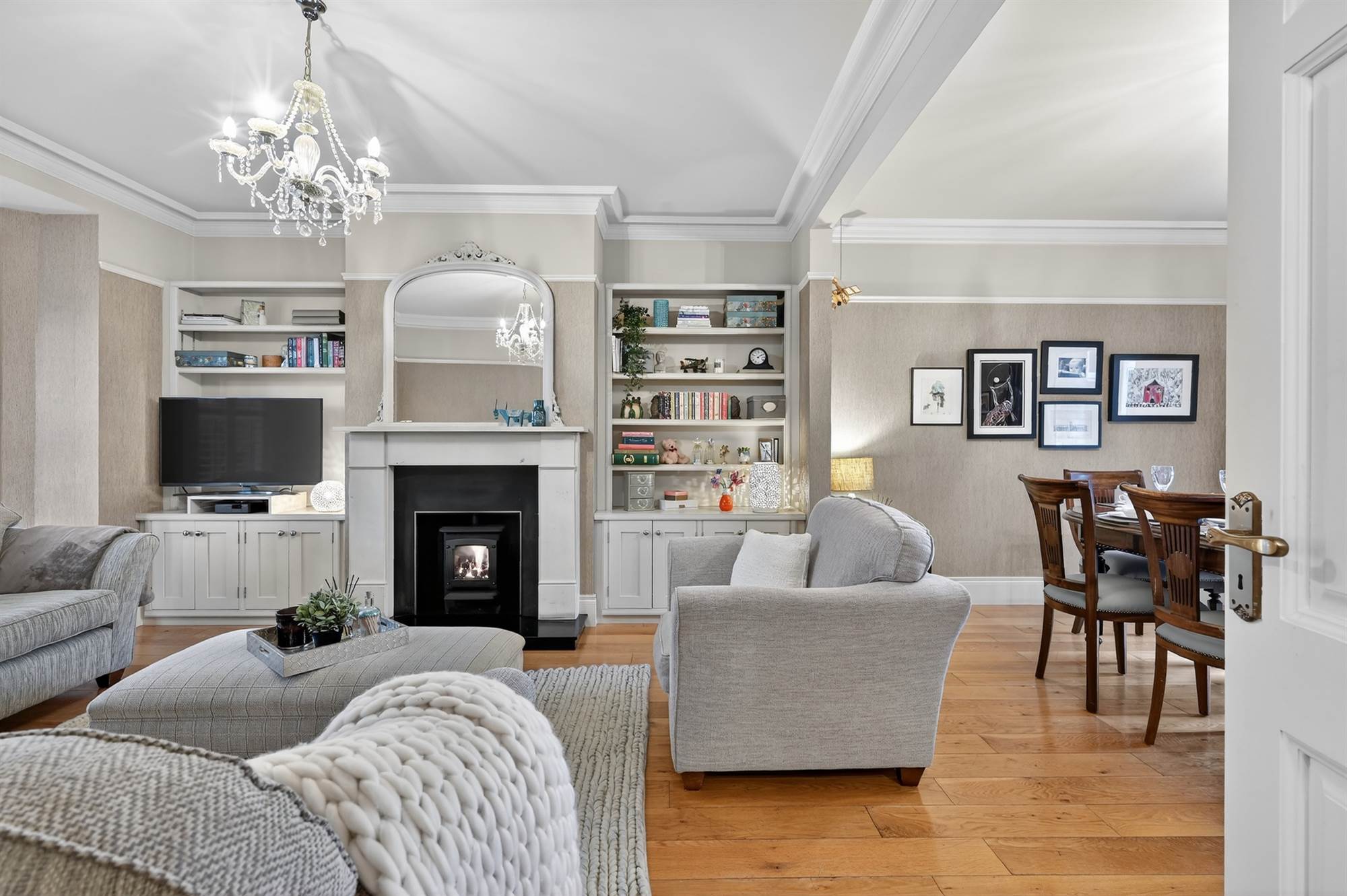 Oak wooden floor, picture rail, cornice ceiling.
