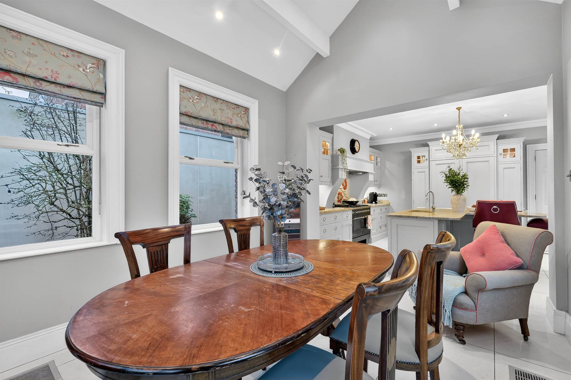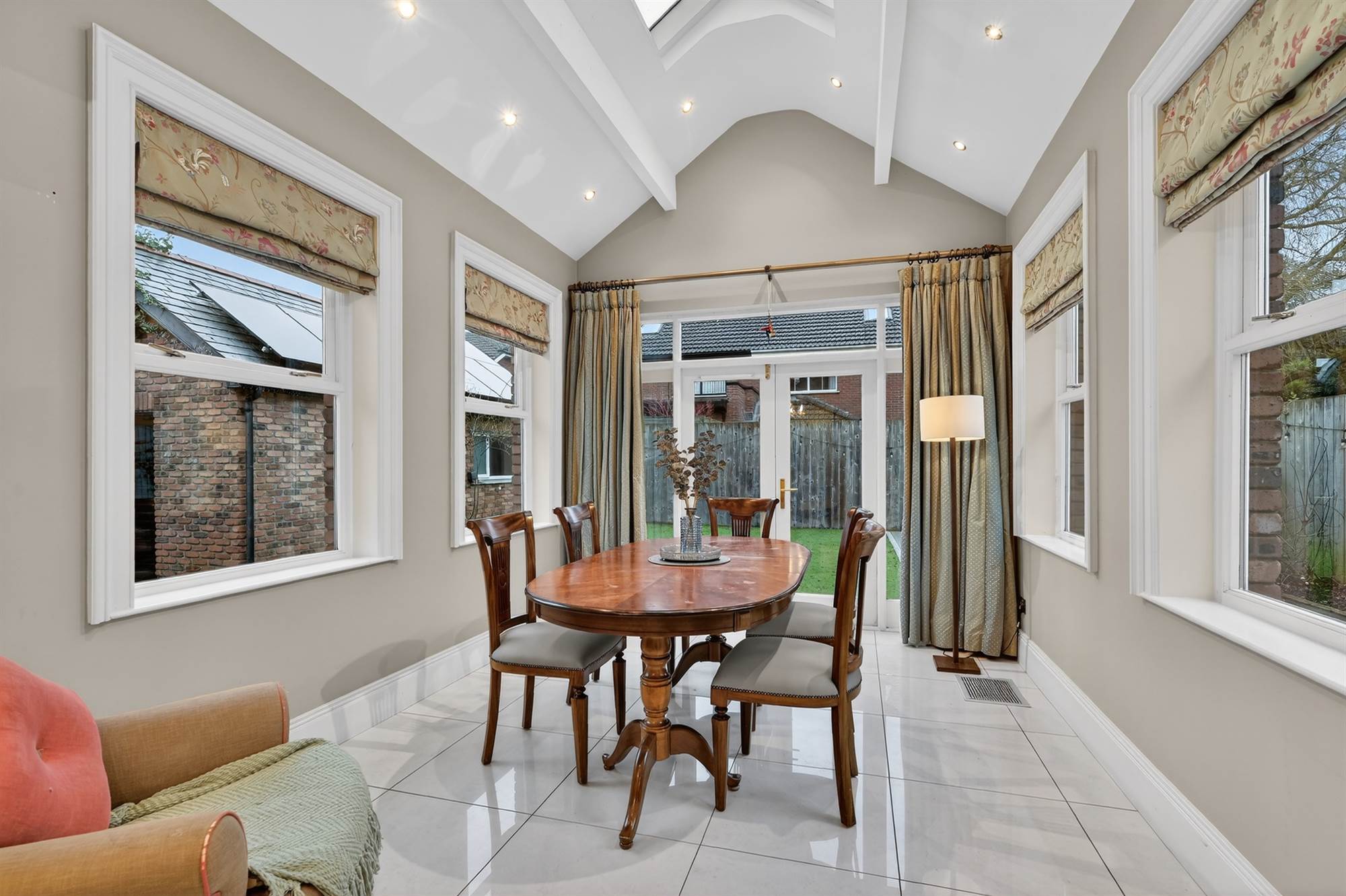 (at widest points). Kitchen featured in "All Ireland Kitchen Guide". Bespoke in-frame Walnut range of high and low level units, built-in glazed display cabinets, granite work surfaces, integrated fridge and freezer, built-in larder cupboard. Built-in Britannia range with six ring gas hob, extractor fan and canopy above. Breakfast island with granite work surfaces, sink and a half sink unit with mixer taps, integrated dishwasher, integrated bin disposal unit, power points. Built-in breakfast bar. Opening to ample dining and living space with porcelain tiled floor. Additional built-in low level units with granite work surfaces, single drainer Belfast sink unit with mixer taps. Hardwood double glazed French doors to garden. Triple aspect windows. uPVC double glazed access door to side. Dining area with vaulted ceiling, Skylight, low voltage spotlights.