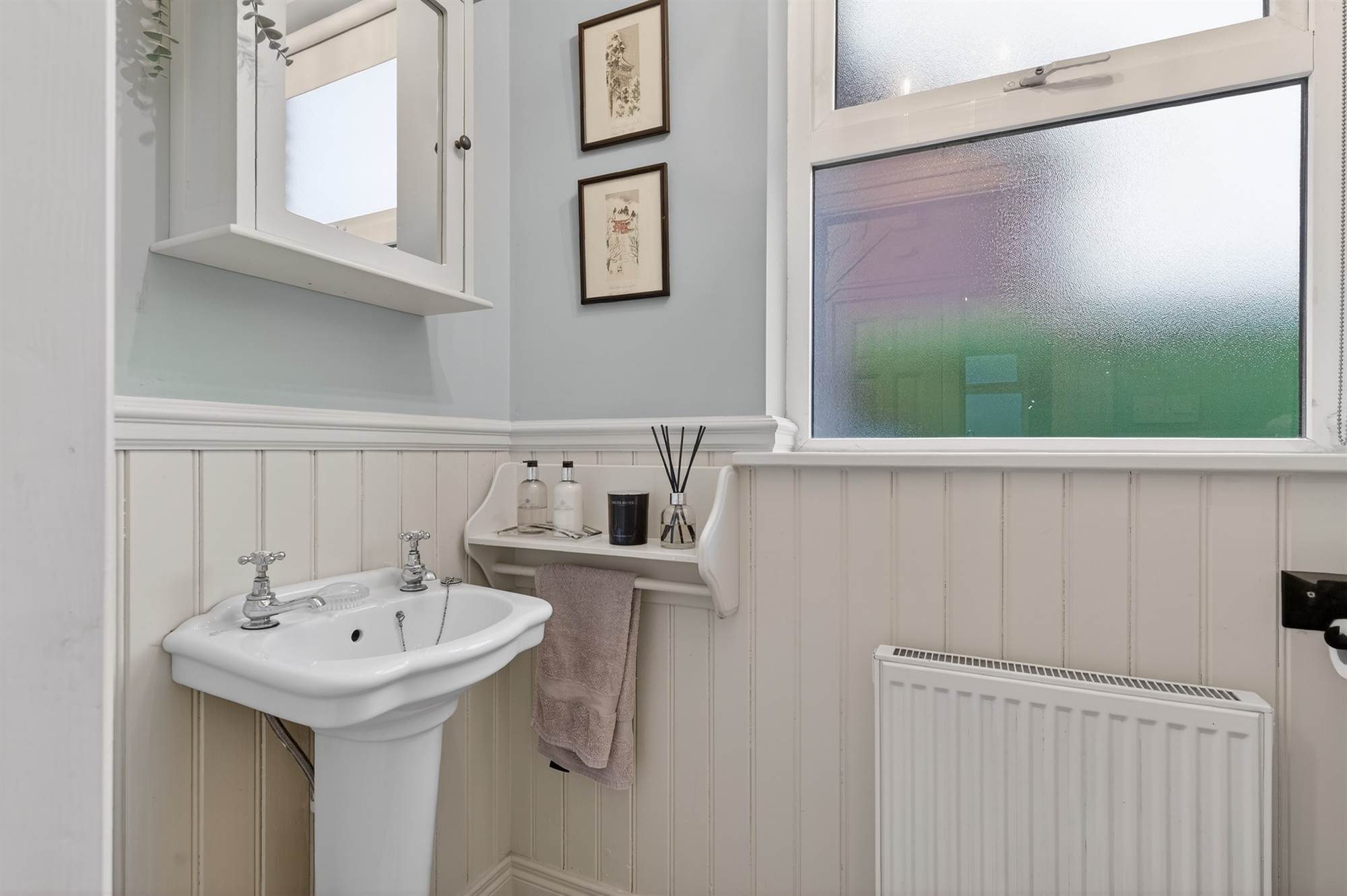White suite comprising low flush wc, pedestal wash hand basin, part wood panelled walls, ceramic tiled floor, extractor fan, ceiling rose, cornice ceiling.