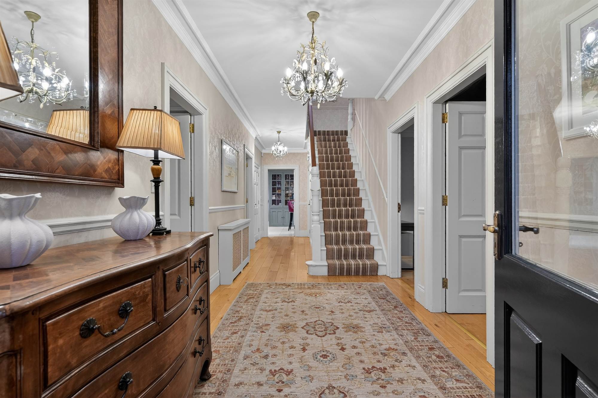 Oak wooden floor, cornice ceiling. Cloaks area and storage under stairs.