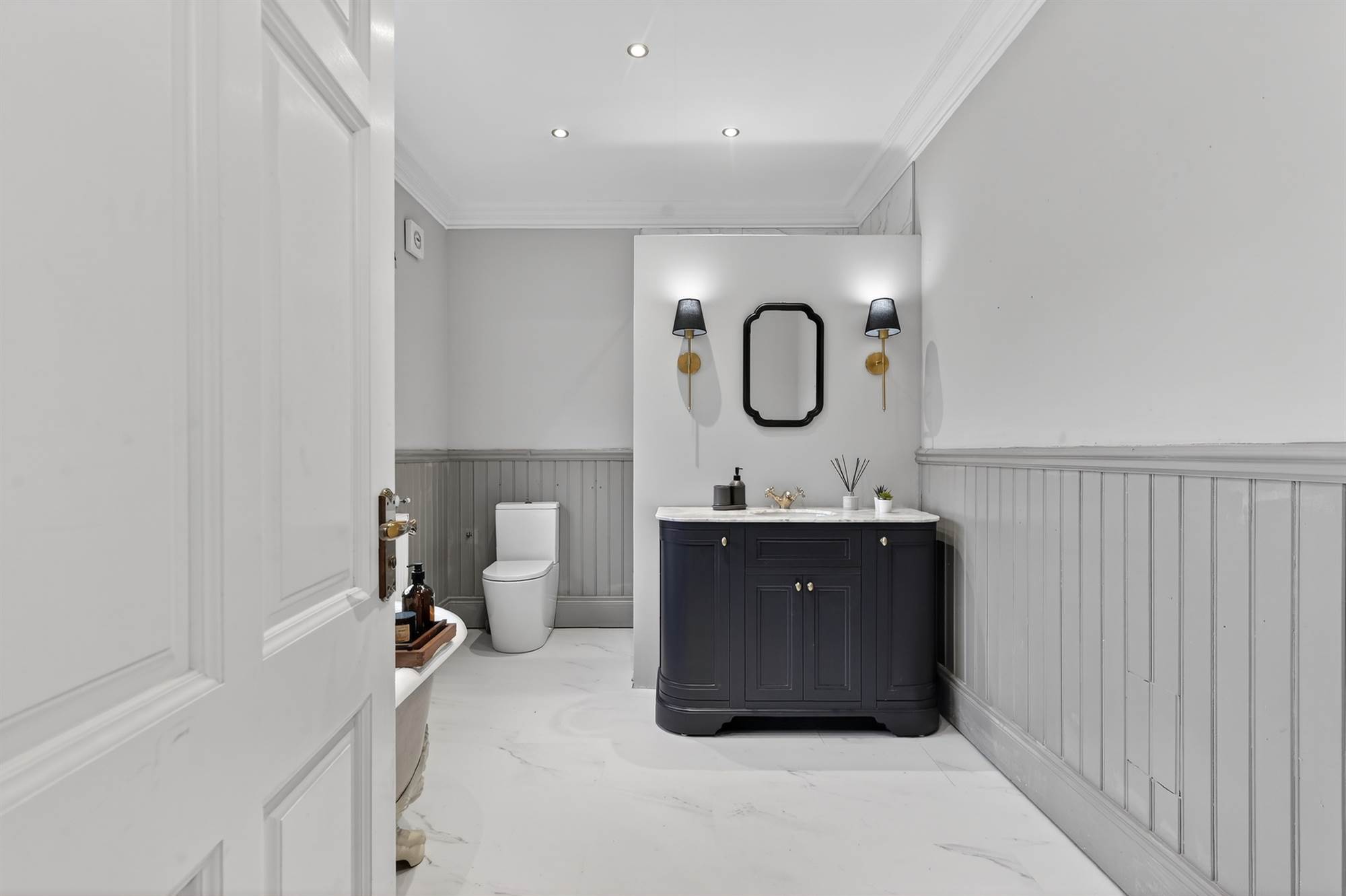 White suite comprising low flush wc, vanity unit with marble top with mixer taps. Cast iron, roll top, claw foot bath with mixer taps, walk-in shower withbrushed brass overhead shower and telephone attachment, tiled splashback, part wood panelled walls, cornice ceiling, low voltage spotlights.